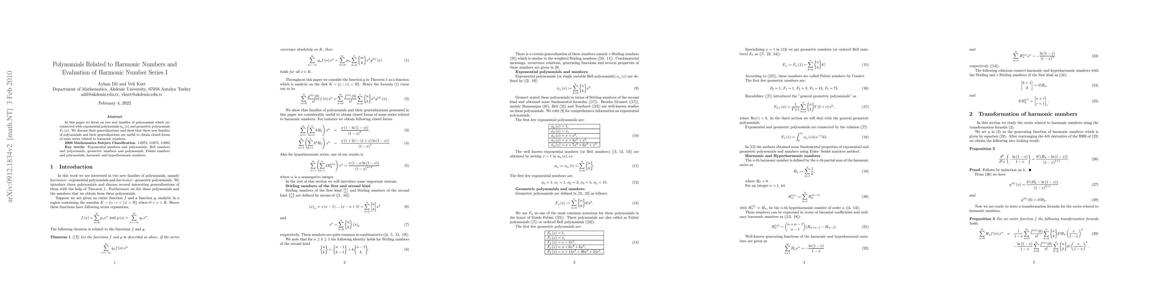 This paper introduces two novel families of polynomials linked to exponential and geometric polynomials, demonstrating their utility in deriving closed forms for series related to harmonic numbers. The study also explores the generalizations of these polynomial families.