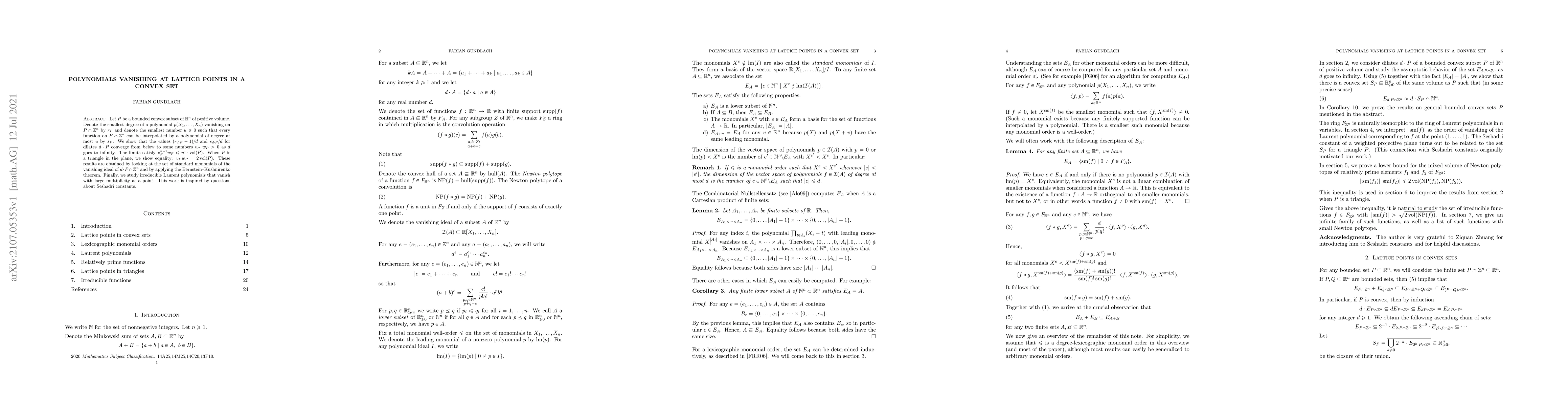 Let $P$ be a bounded convex subset of $\mathbb R^n$ of positive volume. Denote the smallest degree of a polynomial $p(X_1,\dots,X_n)$ vanishing on $P\cap\mathbb Z^n$ by $r_P$ and denote the smallest number $u\geq0$ such that every function on $P\cap\mathbb Z^n$ can be interpolated by a polynomial of degree at most $u$ by $s_P$. We show that the values $(r_{d\cdot P}-1)/d$ and $s_{d\cdot P}/d$ for dilates $d\cdot P$ converge from below to some numbers $v_P,w_P>0$ as $d$ goes to infinity. The limits satisfy $v_P^{n-1}w_P \leq n!\cdot\operatorname{vol}(P)$. When $P$ is a triangle in the plane, we show equality: $v_Pw_P = 2\operatorname{vol}(P)$. These results are obtained by looking at the set of standard monomials of the vanishing ideal of $d\cdot P\cap\mathbb Z^n$ and by applying the Bernstein--Kushnirenko theorem. Finally, we study irreducible Laurent polynomials that vanish with large multiplicity at a point. This work is inspired by questions about Seshadri constants.