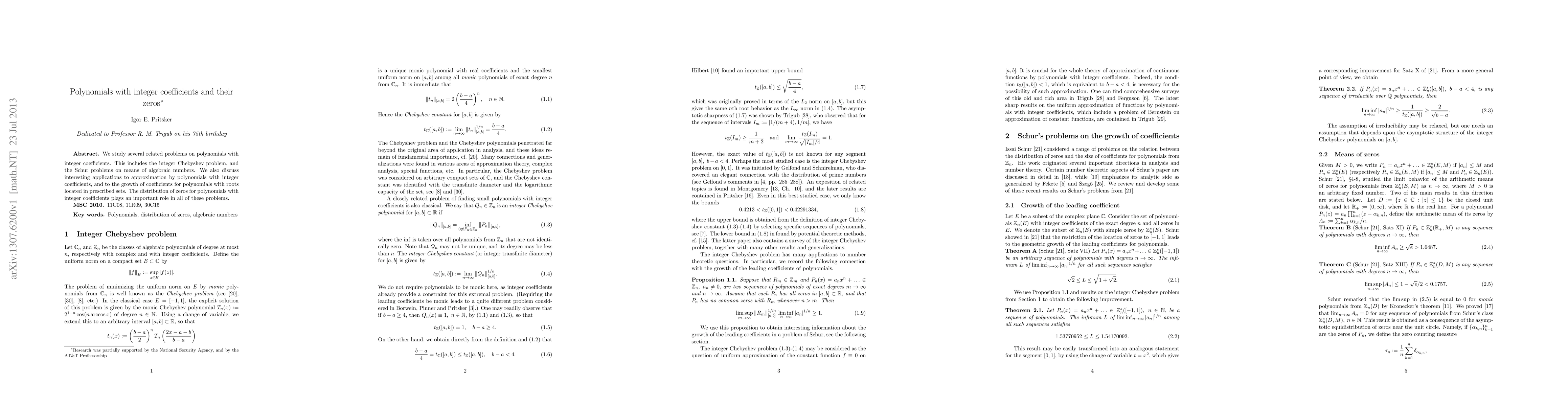 This paper investigates polynomials with integer coefficients, focusing on the integer Chebyshev problem, Schur problems on means of algebraic numbers, and applications to polynomial approximation and coefficient growth. The distribution of zeros is a central theme in these explorations.