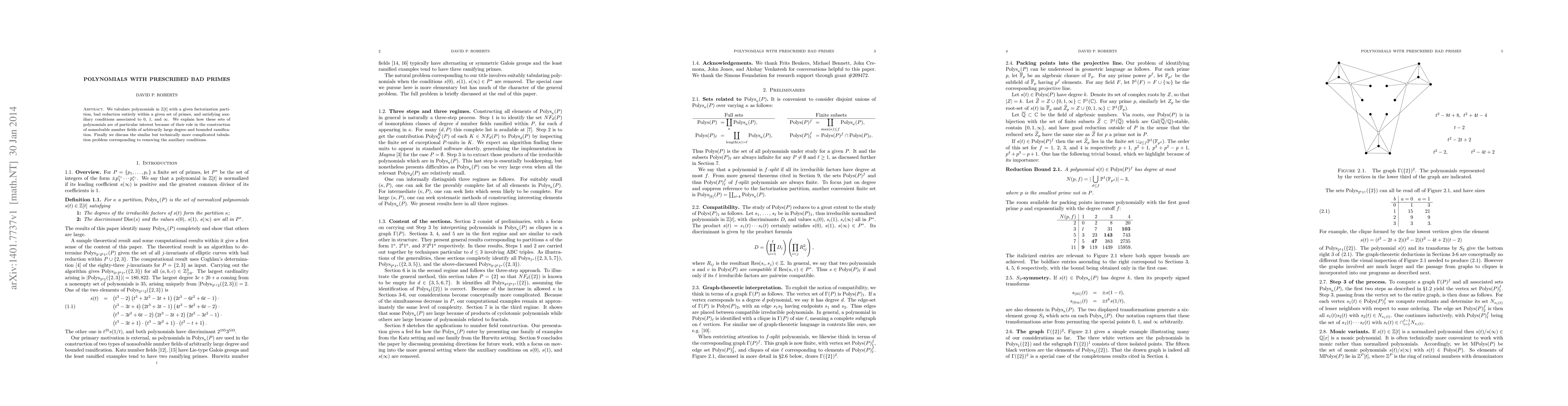We tabulate polynomials in Z[t] with a given factorization partition, bad reduction entirely within a given set of primes, and satisfying auxiliary conditions associated to 0, 1, and infinity. We explain how these sets of polynomials are of particular interest because of their role in the construction of nonsolvable number fields of arbitrarily large degree and bounded ramification. Finally we discuss the similar but technically more complicated tabulation problem corresponding to removing the auxiliary conditions.