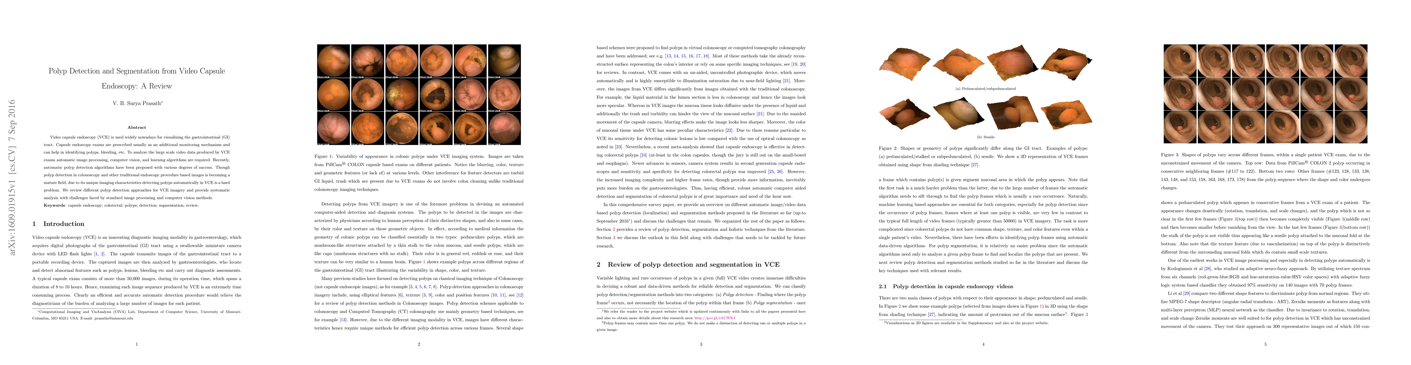 Video capsule endoscopy (VCE) is used widely nowadays for visualizing the gastrointestinal (GI) tract. Capsule endoscopy exams are prescribed usually as an additional monitoring mechanism and can help in identifying polyps, bleeding, etc. To analyze the large scale video data produced by VCE exams automatic image processing, computer vision, and learning algorithms are required. Recently, automatic polyp detection algorithms have been proposed with various degrees of success. Though polyp detection in colonoscopy and other traditional endoscopy procedure based images is becoming a mature field, due to its unique imaging characteristics detecting polyps automatically in VCE is a hard problem. We review different polyp detection approaches for VCE imagery and provide systematic analysis with challenges faced by standard image processing and computer vision methods.