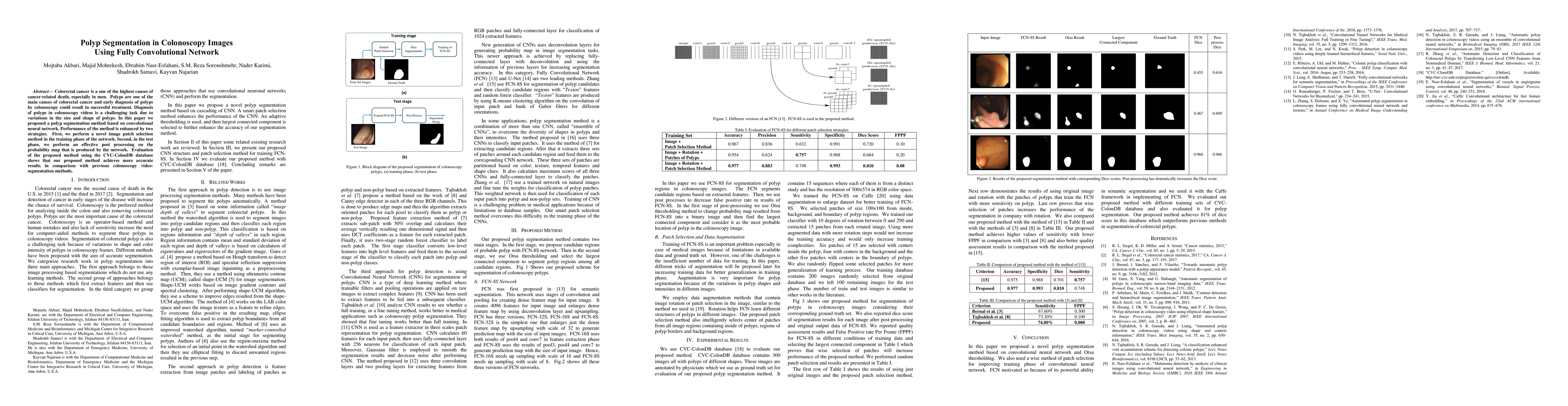 This paper proposes a fully convolutional network for segmenting polyps in colonoscopy images, employing a novel image patch selection method for training and post-processing of the probability map for testing. The method shows improved accuracy over previous segmentation techniques, as evaluated using the CVC-ColonDB database.