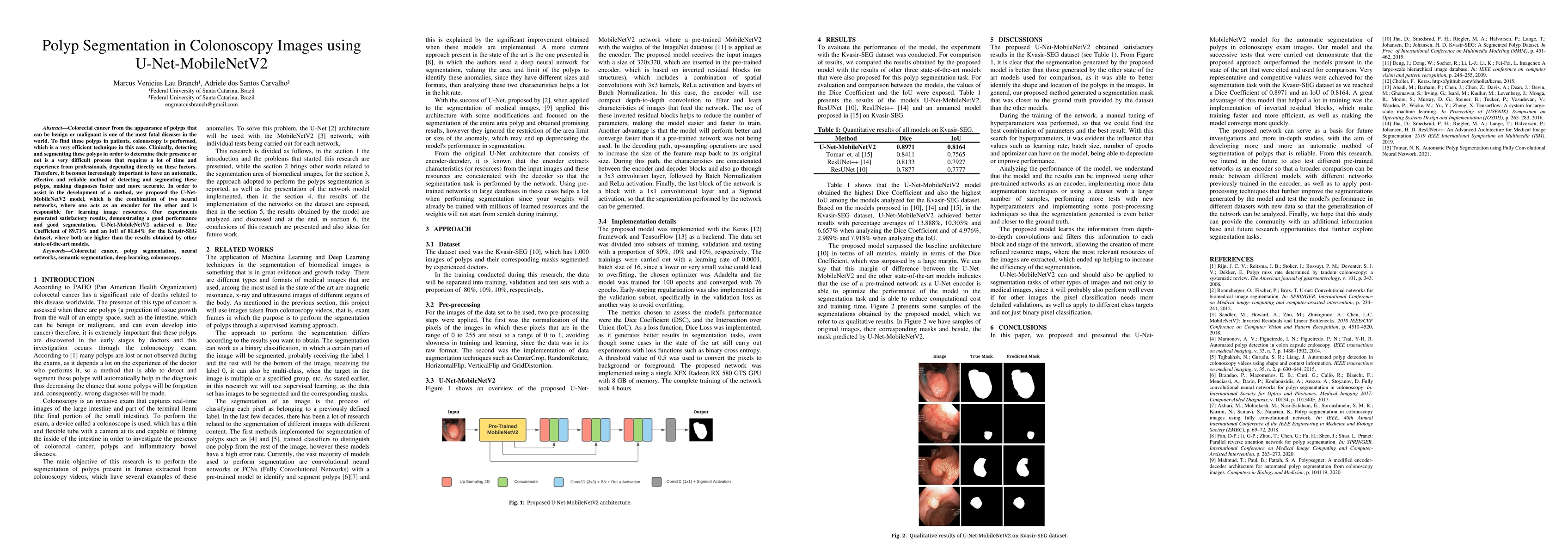 Colorectal cancer from the appearance of polyps that can be benign or malignant is one of the most fatal diseases in the world. To find these polyps in patients, colonoscopy is performed, which is a very efficient technique in this case. Clinically, detecting and segmenting these polyps in order to determine their presence or not is a very difficult process that requires a lot of time and experience from professionals, depending directly on these factors. Therefore, it becomes increasingly important to have an automatic, effective and reliable method of detecting and segmenting these polyps, making diagnoses faster and more accurate. In order to assist in the development of a method, we proposed the U-Net-MobileNetV2 model, which is the combination of two neural networks, where one acts as an encoder for the other and is responsible for learning image resources. Our experiments generated satisfactory results, demonstrating a good performance and good segmentation. U-Net-MobileNetV2 achieved a Dice Coefficient of 89.71% and an IoU of 81.64% for the Kvasir-SEG dataset, where both are higher than the results obtained by other state-of-the-art models.