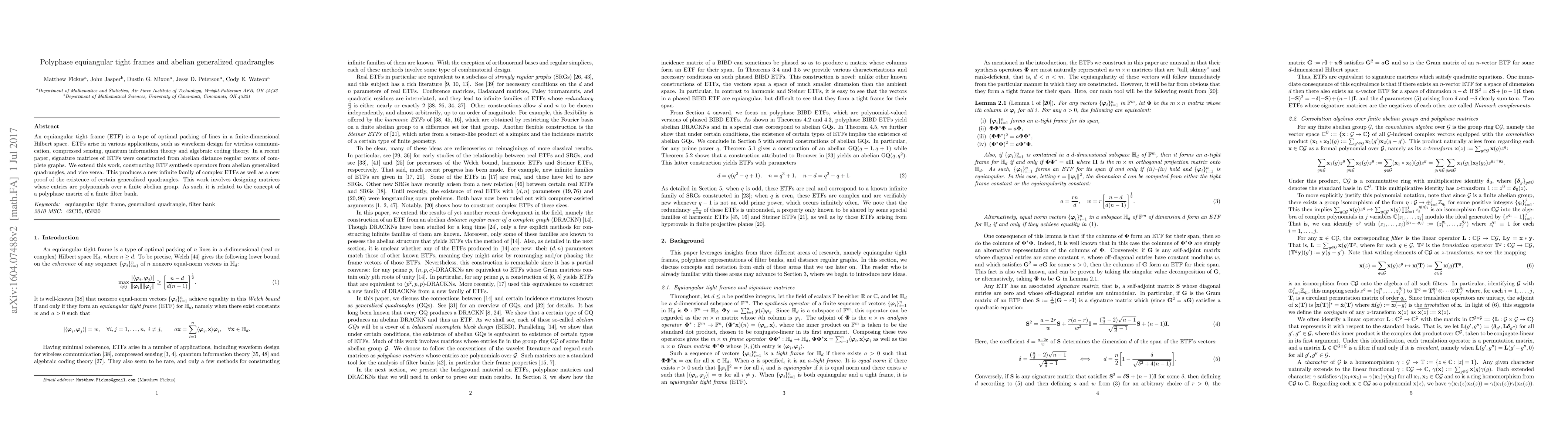 This paper extends the construction of equiangular tight frames (ETFs) from abelian generalized quadrangles, creating new infinite families of complex ETFs and proving the existence of certain generalized quadrangles. The synthesis involves designing matrices with polynomial entries over finite abelian groups, linking to polyphase matrices of finite filter banks.