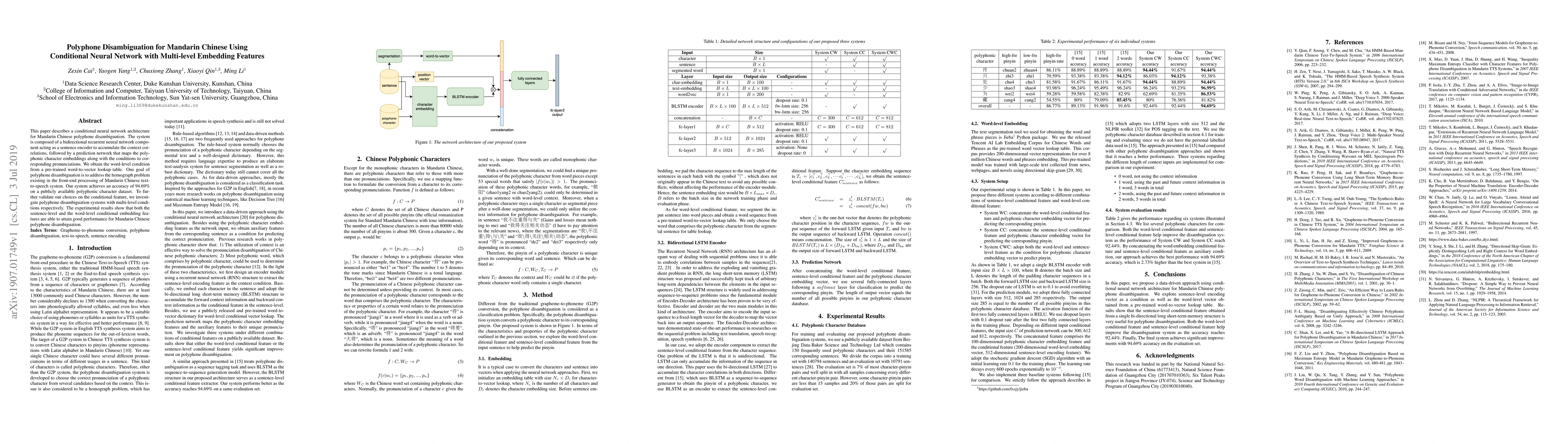 This paper proposes a conditional neural network for Mandarin Chinese polyphone disambiguation, achieving 94.69% accuracy. It uses a bidirectional RNN for context encoding and multi-level embedding features to map polyphonic characters to correct pronunciations.