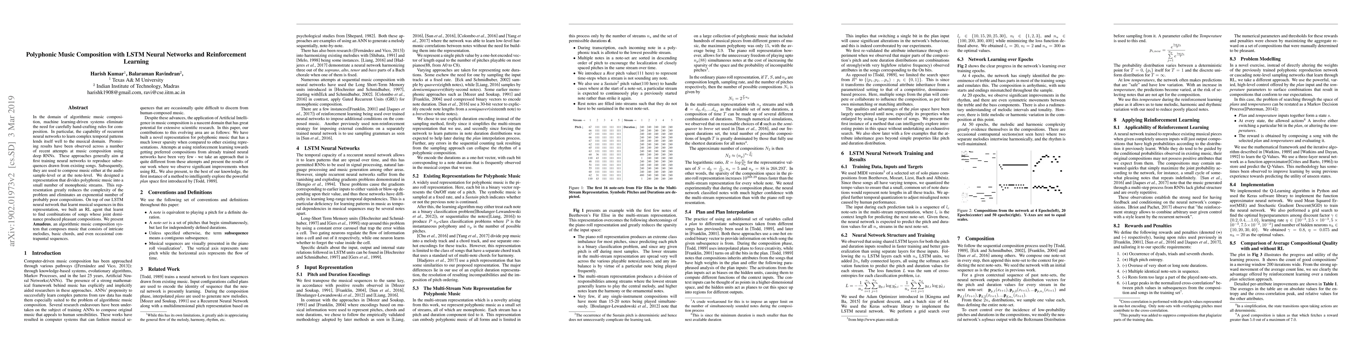 This paper presents Amadeus, a music composition system using LSTM neural networks and reinforcement learning to create polyphonic compositions. The system simplifies complexity by dividing music into monophonic streams, enabling the LSTM to learn sequences and a reinforcement learning agent to find harmonious song combinations.