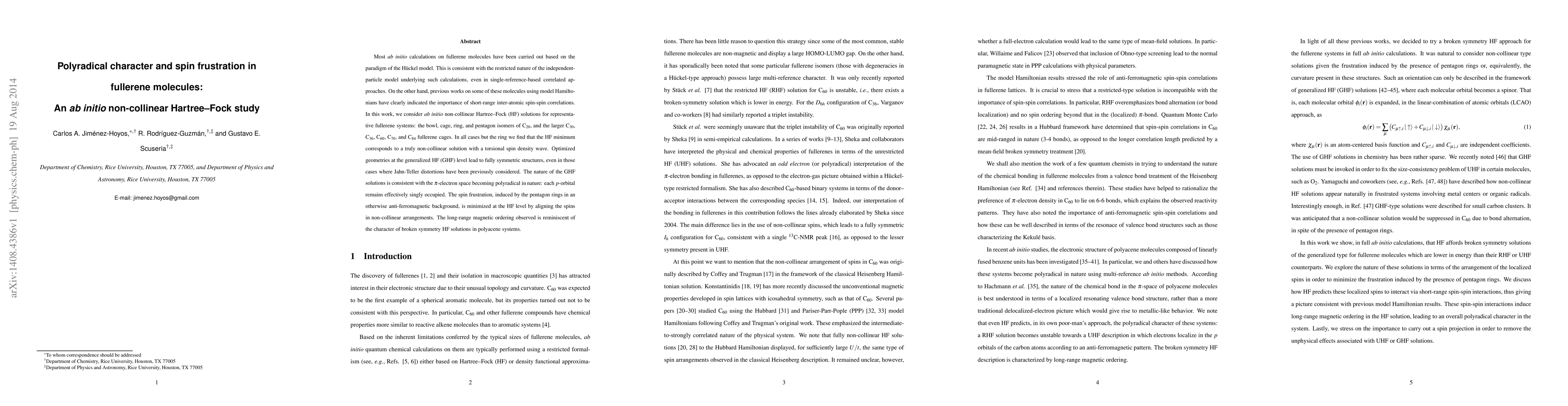 Most {\em ab initio} calculations on fullerene molecules have been carried out based on the paradigm of the H\"uckel model. This is consistent with the restricted nature of the independent-particle model underlying such calculations, even in single-reference-based correlated approaches. On the other hand, previous works on some of these molecules using model Hamiltonians have clearly indicated the importance of short-range inter-atomic spin-spin correlations. In this work, we consider {\em ab initio} non-collinear Hartree--Fock (HF) solutions for representative fullerene systems: the bowl, cage, ring, and pentagon isomers of C$_{20}$, and the larger C$_{30}$, C$_{36}$, C$_{60}$, C$_{70}$, and C$_{84}$ fullerene cages. In all cases but the ring we find that the HF minimum corresponds to a truly non-collinear solution with a torsional spin density wave. Optimized geometries at the generalized HF (GHF) level lead to fully symmetric structures, even in those cases where Jahn-Teller distortions have been previously considered. The nature of the GHF solutions is consistent with the $\pi$-electron space becoming polyradical in nature: each $p$-orbital remains effectively singly occupied. The spin frustration, induced by the pentagon rings in an otherwise anti-ferromagnetic background, is minimized at the HF level by aligning the spins in non-collinear arrangements. The long-range magnetic ordering observed is reminiscent of the character of broken symmetry HF solutions in polyacene systems.