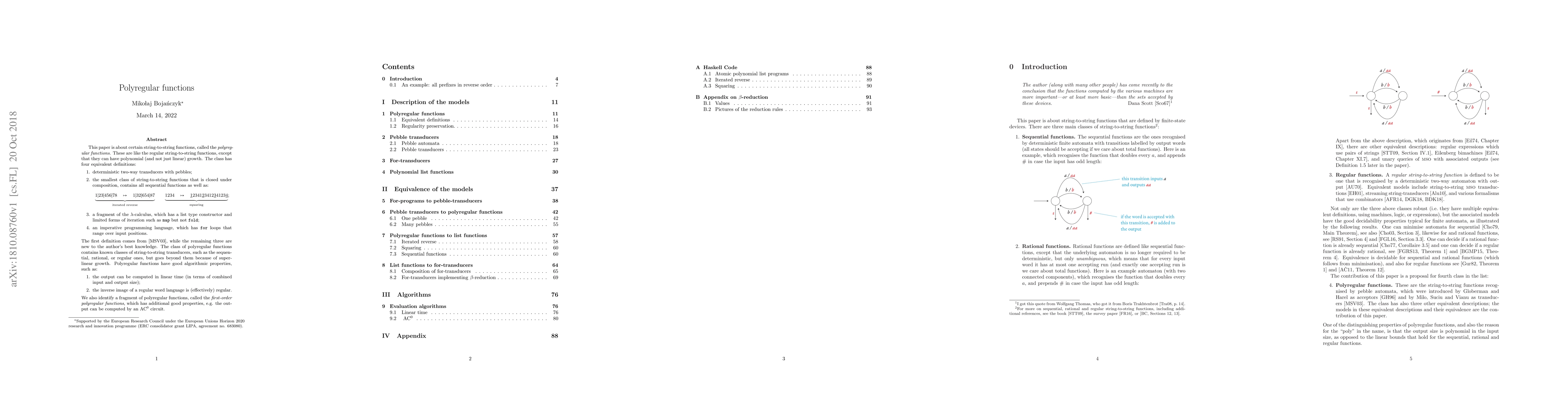 The paper introduces polyregular functions, providing four equivalent definitions: deterministic two-way transducers with pebbles, a minimal class of string-to-string functions closed under composition, a fragment of lambda-calculus with list type constructor and limited iteration, and an imperative programming language with for-loops over input positions.