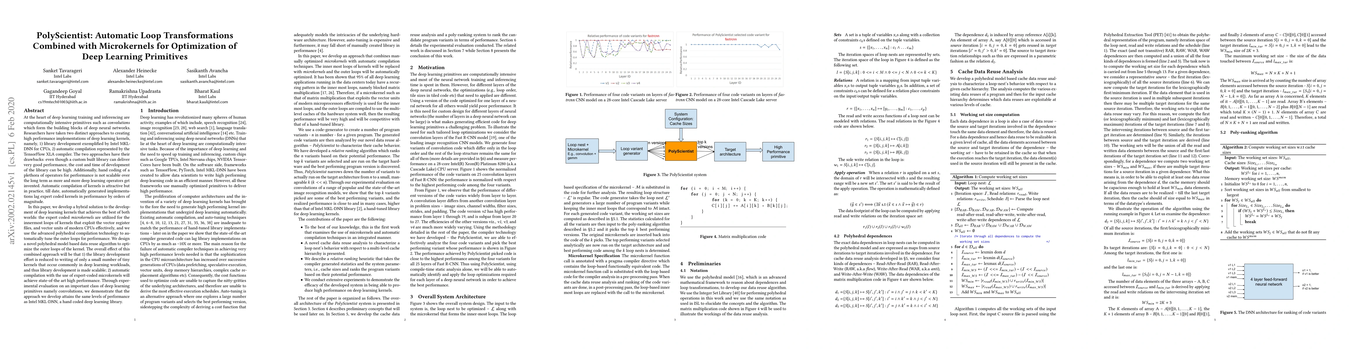 This paper introduces PolyScientist, a hybrid approach combining expert-coded microkernels with automatic loop transformations using polyhedral modeling to optimize deep learning primitives like convolutions. The proposed method achieves performance comparable to highly optimized libraries like Intel MKL-DNN, balancing the benefits of both custom libraries and automatic compilation.