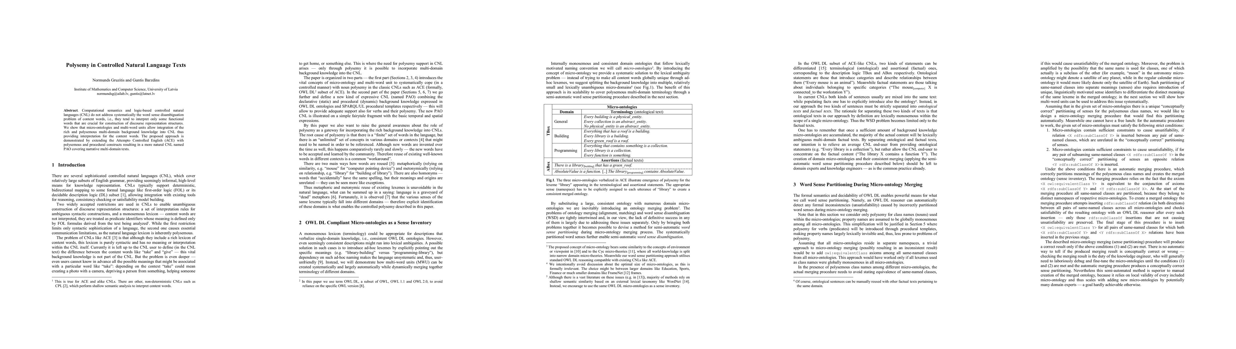 Computational semantics and logic-based controlled natural languages (CNL) do not address systematically the word sense disambiguation problem of content words, i.e., they tend to interpret only some functional words that are crucial for construction of discourse representation structures. We show that micro-ontologies and multi-word units allow integration of the rich and polysemous multi-domain background knowledge into CNL thus providing interpretation for the content words. The proposed approach is demonstrated by extending the Attempto Controlled English (ACE) with polysemous and procedural constructs resulting in a more natural CNL named PAO covering narrative multi-domain texts.