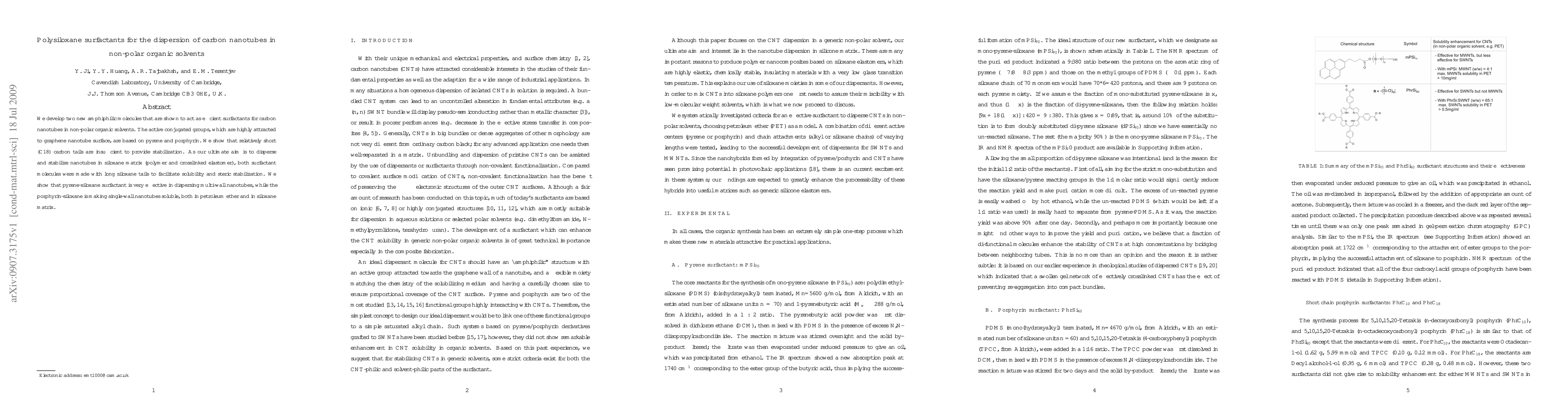 This paper develops two new amphiphilic surfactants based on pyrene and porphyrin for dispersing carbon nanotubes in non-polar solvents. Long siloxane tails enhance solubility and steric stabilization, with the pyrene-siloxane surfactant effectively dispersing multi-wall nanotubes and the porphyrin-siloxane surfactant solubilizing single-wall nanotubes.