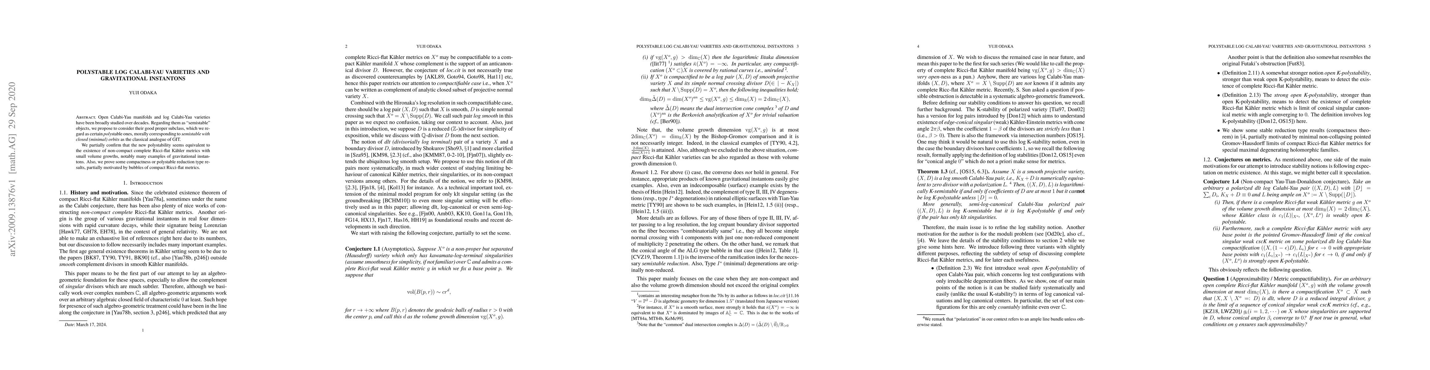 Open Calabi-Yau manifolds and log Calabi-Yau varieties have been broadly studied over decades. Regarding them as "semistable" objects, we propose to consider their good proper subclass, which we regard as certain poly-stable ones, morally corresponding to semistable with closed (minimal) orbits} as the classical analogue of GIT. We partially confirm that the new polystability seems equivalent to the existence of non-compact complete Ricci-flat Kahler metrics with small volume growths, notably many examples of gravitational instantons. Also, we prove some compactness or polystable reduction type results, partially motivated by bubbles of compact Ricci-flat metrics.