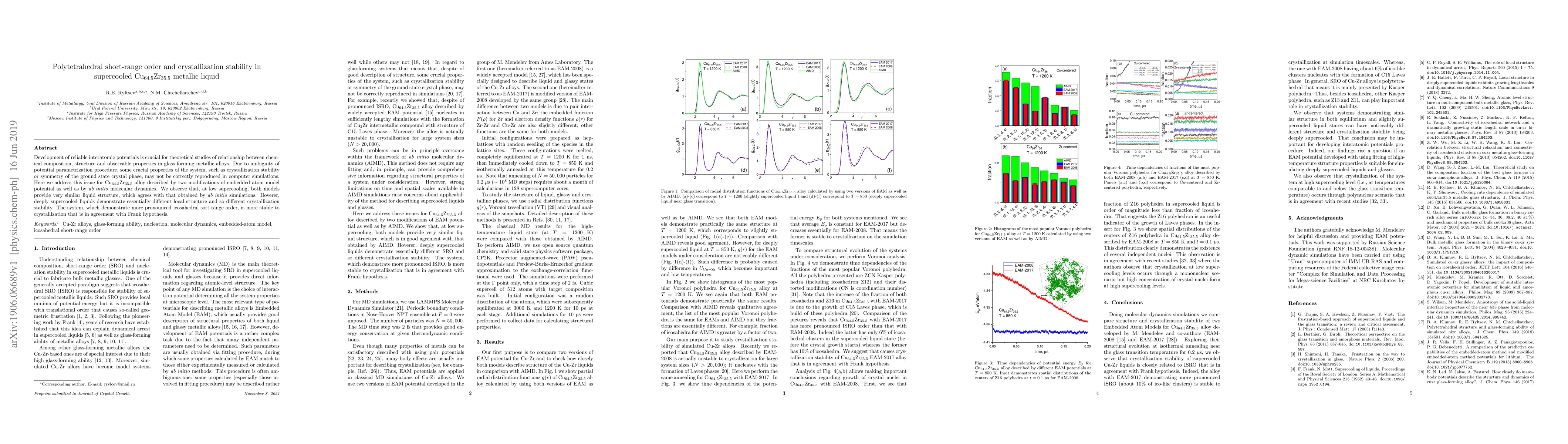 Development of reliable interatomic potentials is crucial for theoretical studies of relationship between chemical composition, structure and observable properties in glass-forming metallic alloys. Due to ambiguity of potential parametrization procedure, some crucial properties of the system, such as crystallization stability or symmetry of the ground state crystal phase, may not be correctly reproduced in computer simulations. Here we address this issue for ${\rm Cu_{64.5}Zr_{35.5}}$ alloy described by two modifications of embedded atom model potential as well as by \textit{ab initio} molecular dynamics. We observe that, at low supercooling, both models provide very similar liquid structure, which agrees with that obtained by \textit{ab initio} simulations. Hoverer, deeply supercooled liquids demonstrate essentially different local structure and so different crystallization stability. The system, which demonstrate more pronounced icosahedral sort-range order, is more stable to crystallization that is in agreement with Frank hypothesis.