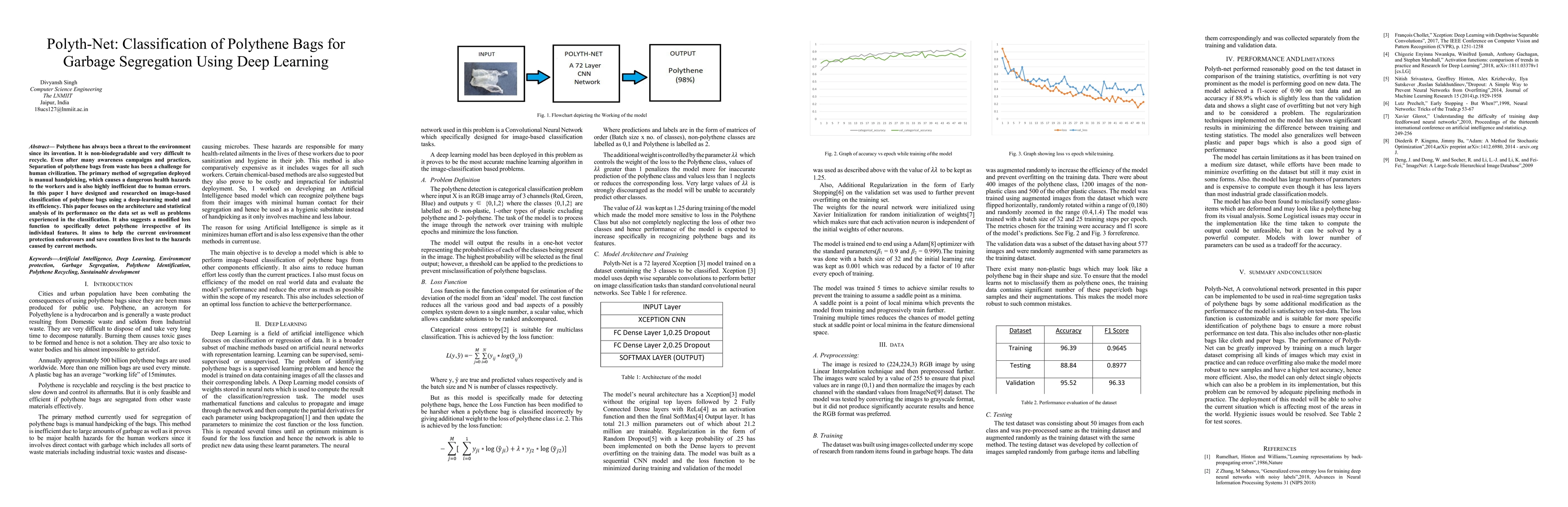 Polythene has always been a threat to the environment since its invention. It is non-biodegradable and very difficult to recycle. Even after many awareness campaigns and practices, Separation of polythene bags from waste has been a challenge for human civilization. The primary method of segregation deployed is manual handpicking, which causes a dangerous health hazards to the workers and is also highly inefficient due to human errors. In this paper I have designed and researched on image-based classification of polythene bags using a deep-learning model and its efficiency. This paper focuses on the architecture and statistical analysis of its performance on the data set as well as problems experienced in the classification. It also suggests a modified loss function to specifically detect polythene irrespective of its individual features. It aims to help the current environment protection endeavours and save countless lives lost to the hazards caused by current methods.