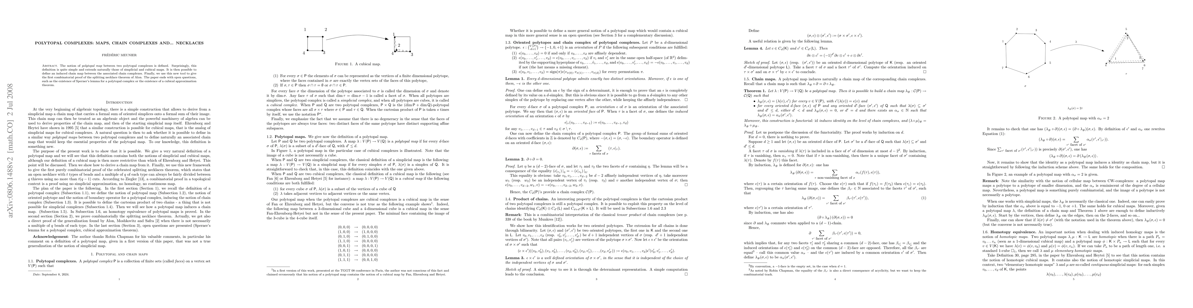 This paper defines polytopal maps between complexes and extends existing notions of simplicial and cubical maps. It introduces an induced chain map and uses this to provide a combinatorial proof for the splitting necklace theorem, concluding with open questions on Sperner's lemma and cubical approximation.