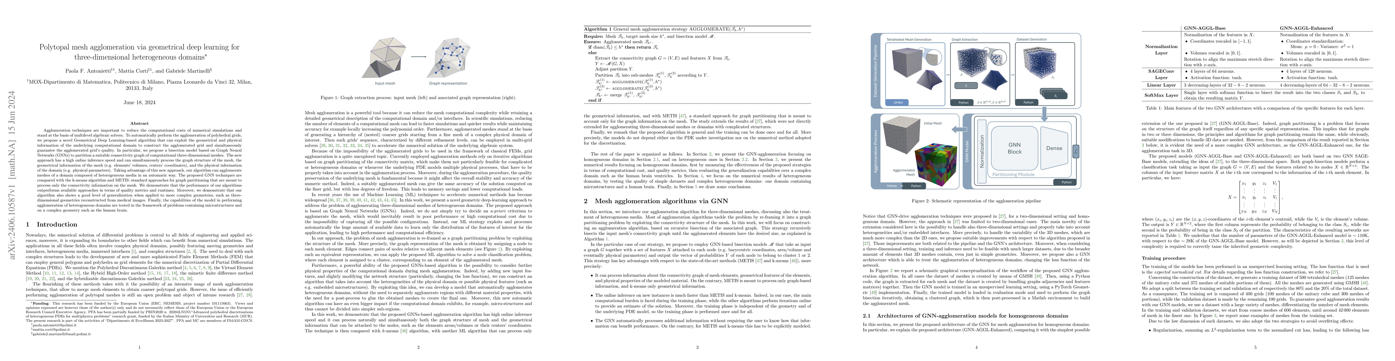 This research proposes a novel Geometrical Deep Learning algorithm using Graph Neural Networks (GNNs) to automatically agglomerate polyhedral grids in three-dimensional heterogeneous domains, outperforming traditional methods in quality metrics and runtime. The approach effectively processes geometrical and physical information to construct high-quality agglomerated grids.