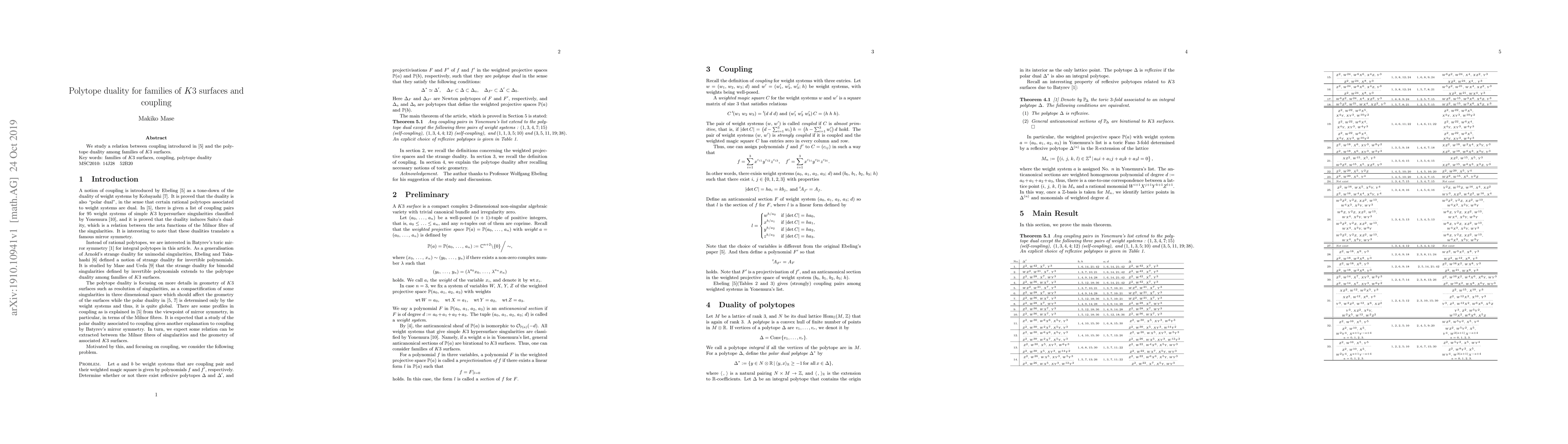 This research explores the connection between Ebeling's coupling concept and the duality of polytopes in families of $K3$ surfaces, aiming to elucidate how these mathematical structures interact and relate.