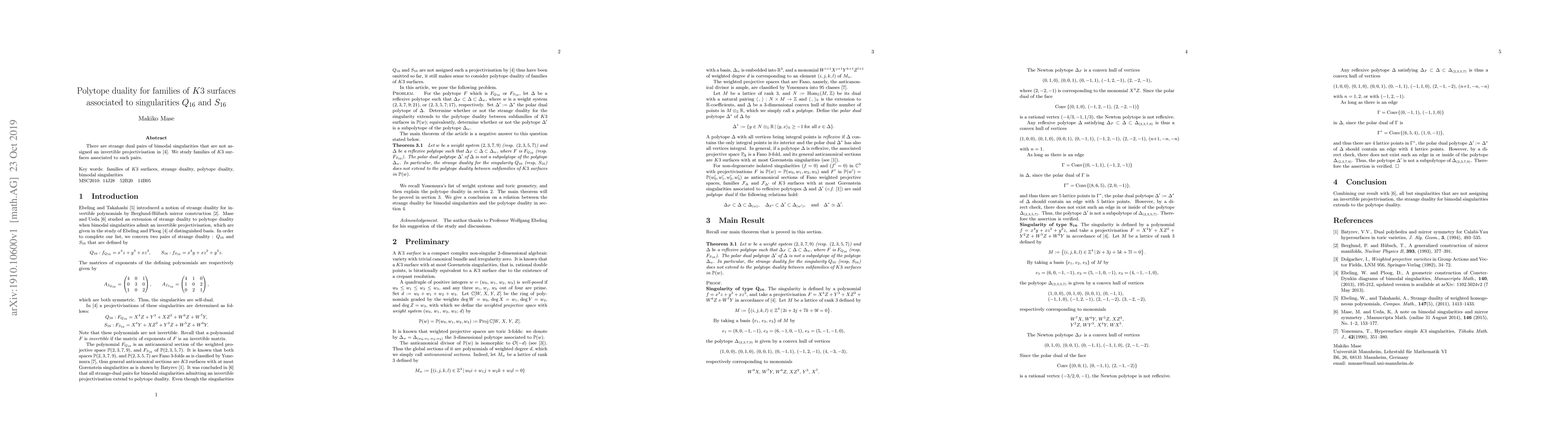 Summary: This paper investigates unique dual pairs of bimodal singularities, $Q_{16}$ and $S_{16}$, exploring associated families of $K3$ surfaces that lack an invertible projectivisation as defined in EbelingPloog. It seeks to understand the polytope duality within these contexts.