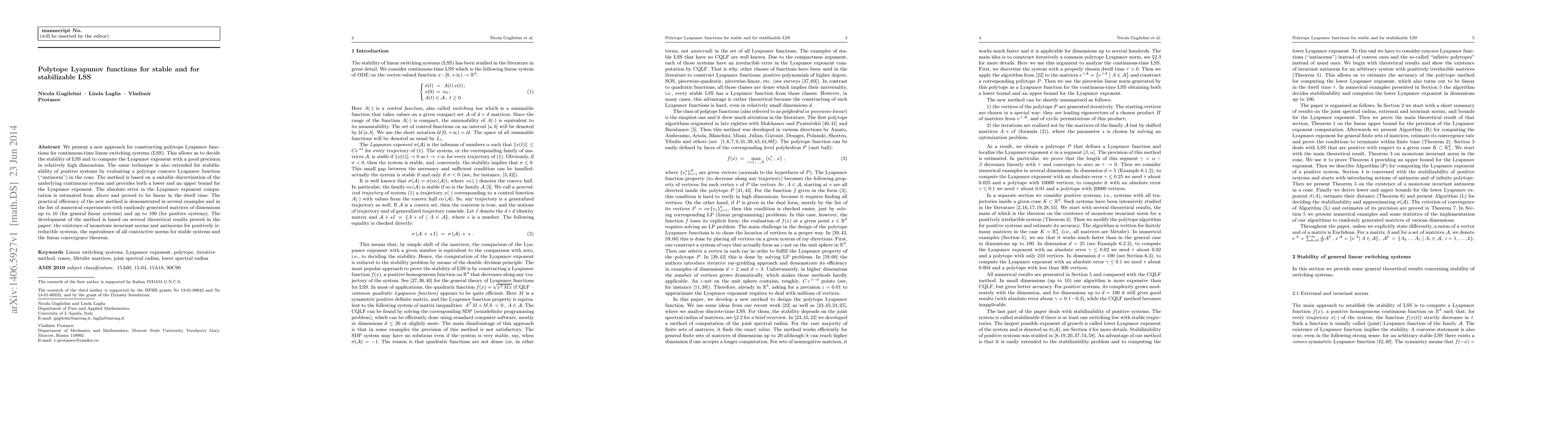 This paper introduces a novel method for constructing polytope Lyapunov functions to determine stability and compute Lyapunov exponents for continuous-time linear switching systems. The approach extends to stabilizability of positive systems and provides both lower and upper bounds for the Lyapunov exponent, with linear error dependence on dwell time.