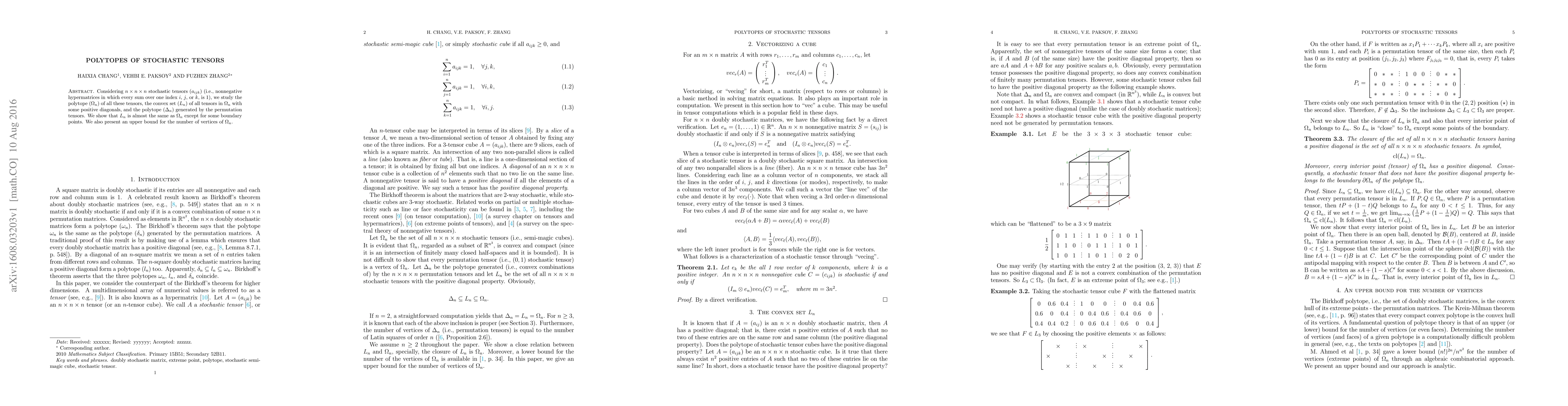 This paper investigates the polytopes of $n\times n\times n$ stochastic tensors, demonstrating that the convex set with positive diagonals ($L_n$) closely resembles the full set ($\Omega_{n}$) except for boundary points, and provides an upper bound for the number of vertices in $\Omega_{n}$.