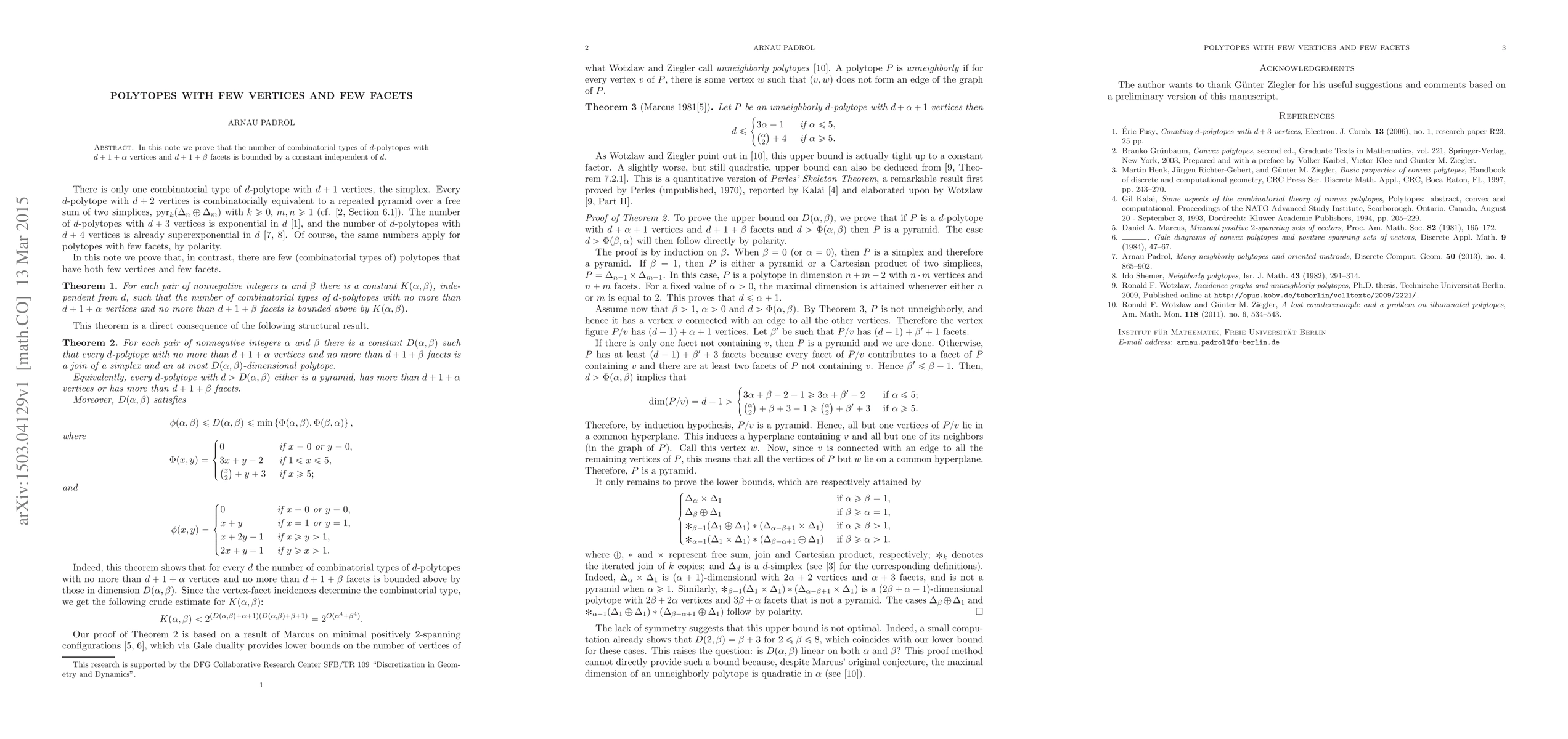 The paper establishes structural results and bounds on the number of combinatorial types of d-polytopes with few vertices and few facets, utilizing Marcus' theorem on minimal positively 2-spanning configurations.