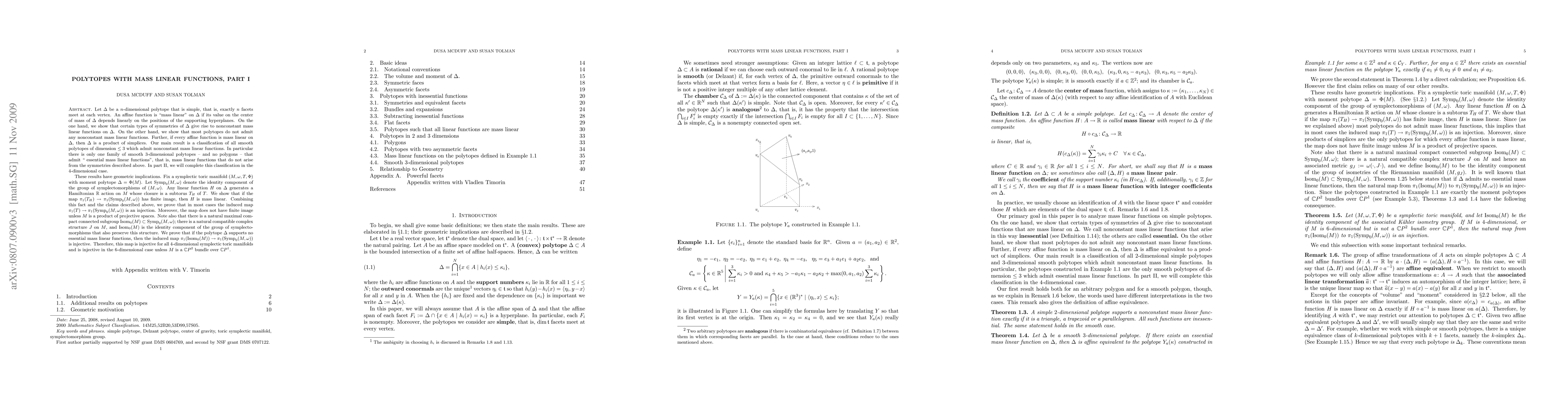 We analyze mass linear functions $H$ on simple polytopes $\De$, where a mass linear function is an affine function on $\De$ whose value on the center of mass depends linearly on the positions of the supporting hyperplanes. We show that certain types of symmetries of $\De$ give rise to nonconstant mass linear functions on $\De$. These are called inessential; the others are essential. We also show that most polytopes do not admit any nonconstant mass linear functions. Our main result shows that there is only one family of smooth polytopes of dimension $\leq 3$ which admit essential mass linear functions. These results have geometric implications. Fix a symplectic toric manifold $(M,\om,T,\Phi)$ with moment polytope $\De = \Phi(M)$; let $\Symp(M,\om)$ be its group of symplectomorphisms. Any linear function $H$ on $\De$ generates a Hamiltonian $\R$ action on $M$ whose closure is a subtorus $T_H$ of $T$. We show that if the map $\pi_1(T_H)\to \pi_1(\Symp(M,\om))$ has finite image, then $H$ is mass linear. Therefore, in most cases the induced map $\pi_1(T) \to \pi_1(\Symp(M,\om))$ is an injection. We also show that this map does not have finite image unless $M$ is a product of projective spaces. Moreover, the inessential $H$ correspond to elements in the kernel of the map $\pi_1(T)\to \Isom(M)$, where the Kahler isometry group $\Isom(M)\subset \Symp(M,\om)$ consists of elements that also preserve the natural compatible complex structure on $M$. Therefore if $\De$ supports no nonconstant essential mass linear $H$, the map $\pi_1(\Isom(M))\to pi_1(\Symp(M,\om)$ is injective.