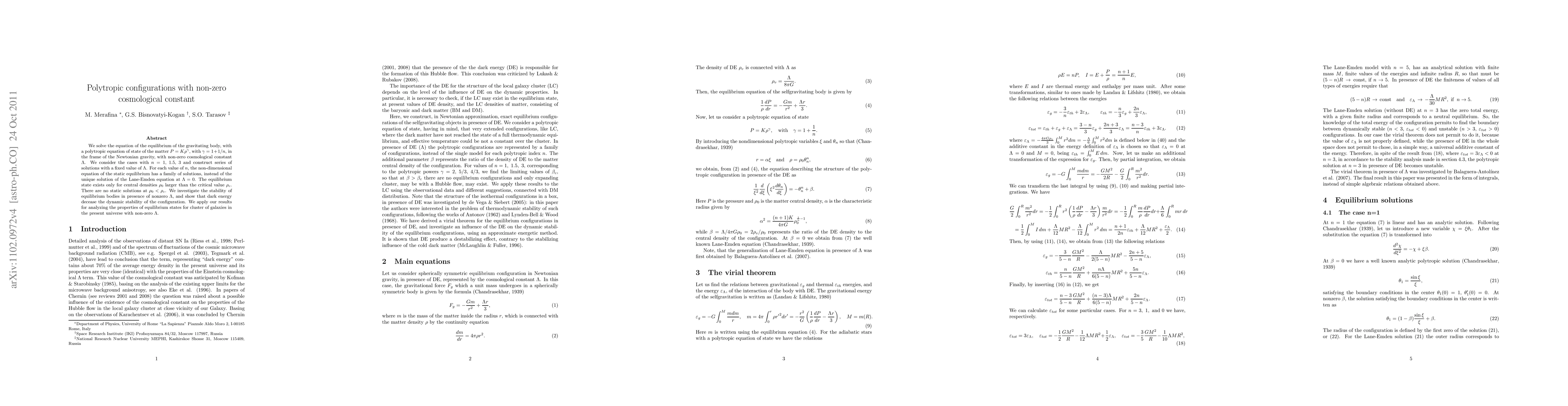 We solve the equation of the equilibrium of the gravitating body, with a polytropic equation of state of the matter $P=K\rho^{\gamma}$, with $\gamma=1+1/n$, in the frame of the Newtonian gravity, with non-zero cosmological constant $\Lambda$. We consider the cases with $n=1,\,\,1.5,\,\,3$ and construct series of solutions with a fixed value of $\Lambda$. For each value of $n$, the non-dimensional equation of the static equilibrium has a family of solutions, instead of the unique solution of the Lane-Emden equation at $\Lambda=0$. The equilibrium state exists only for central densities $\rho_0$ larger than the critical value $\rho_c$. There are no static solutions at $\rho_0 < \rho_c$. We find the values of $\rho_c$ for each value of $n$ and show that the presence of dark energy decrease the dynamic stability of the configuration. We apply our results for analyzing the possibility of existence of equilibrium states for cluster of galaxies in the present universe with non-zero $\Lambda$.