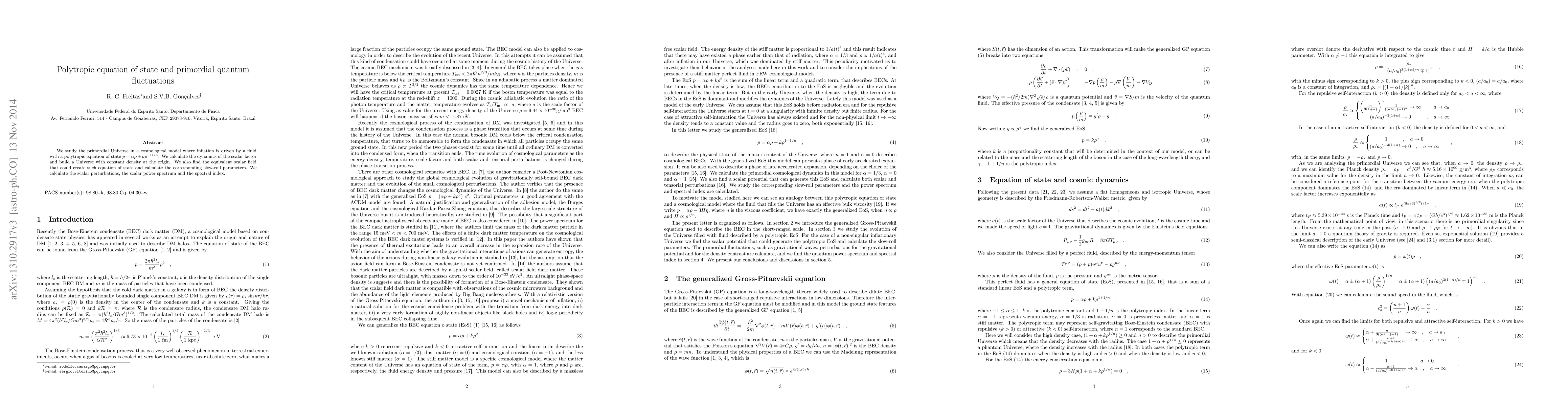 We study the primordial Universe in a cosmological model where inflation is driven by a fluid with a polytropic equation of state $p = \alpha\rho + k\rho^{1 + 1/n}$. We calculate the dynamics of the scalar factor and build a Universe with constant density at the origin. We also find the equivalent scalar field that could create such equation of state and calculate the corresponding slow-roll parameters. We calculate the scalar perturbations, the scalar power spectrum and the spectral index.