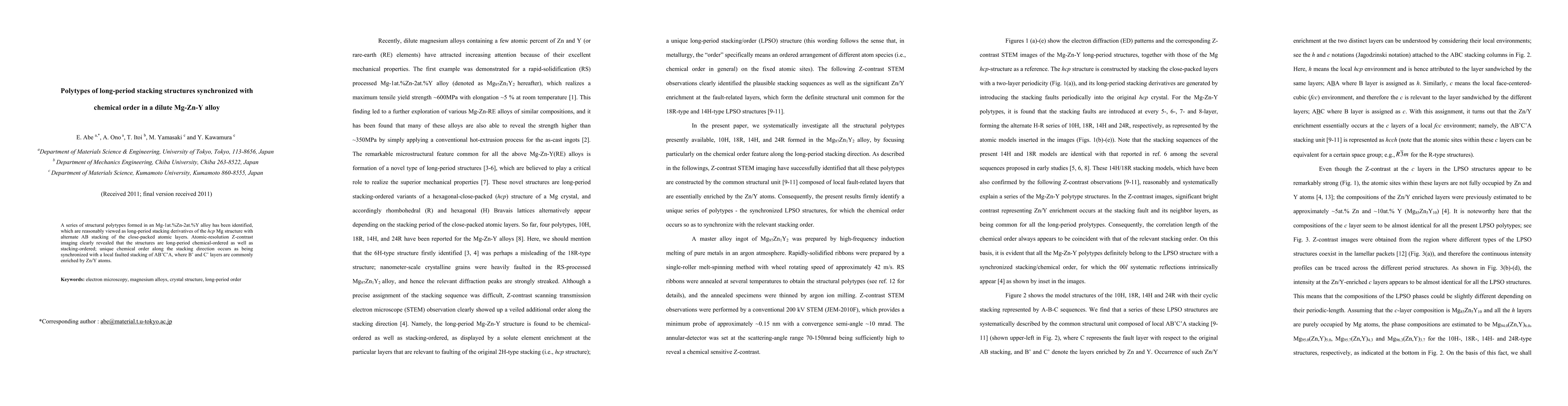This study identifies structural polytypes in an Mg-1at.%Zn-2at.%Y alloy, revealing long-period stacking derivatives of the hcp Mg structure with alternating AB stacking. Atomic-resolution imaging shows these polytypes exhibit synchronized chemical and stacking order, with Zn/Y atoms enriching specific layers.