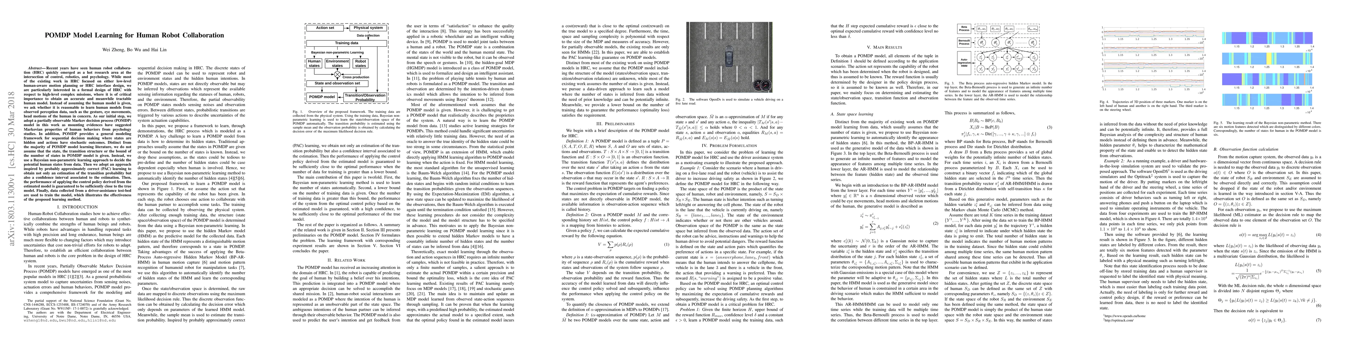 Recent years have seen human robot collaboration (HRC) quickly emerged as a hot research area at the intersection of control, robotics, and psychology. While most of the existing work in HRC focused on either low-level human-aware motion planning or HRC interface design, we are particularly interested in a formal design of HRC with respect to high-level complex missions, where it is of critical importance to obtain an accurate and meanwhile tractable human model. Instead of assuming the human model is given, we ask whether it is reasonable to learn human models from observed perception data, such as the gesture, eye movements, head motions of the human in concern. As our initial step, we adopt a partially observable Markov decision process (POMDP) model in this work as mounting evidences have suggested Markovian properties of human behaviors from psychology studies. In addition, POMDP provides a general modeling framework for sequential decision making where states are hidden and actions have stochastic outcomes. Distinct from the majority of POMDP model learning literature, we do not assume that the state, the transition structure or the bound of the number of states in POMDP model is given. Instead, we use a Bayesian non-parametric learning approach to decide the potential human states from data. Then we adopt an approach inspired by probably approximately correct (PAC) learning to obtain not only an estimation of the transition probability but also a confidence interval associated to the estimation. Then, the performance of applying the control policy derived from the estimated model is guaranteed to be sufficiently close to the true model. Finally, data collected from a driver-assistance test-bed are used to train the model, which illustrates the effectiveness of the proposed learning method.