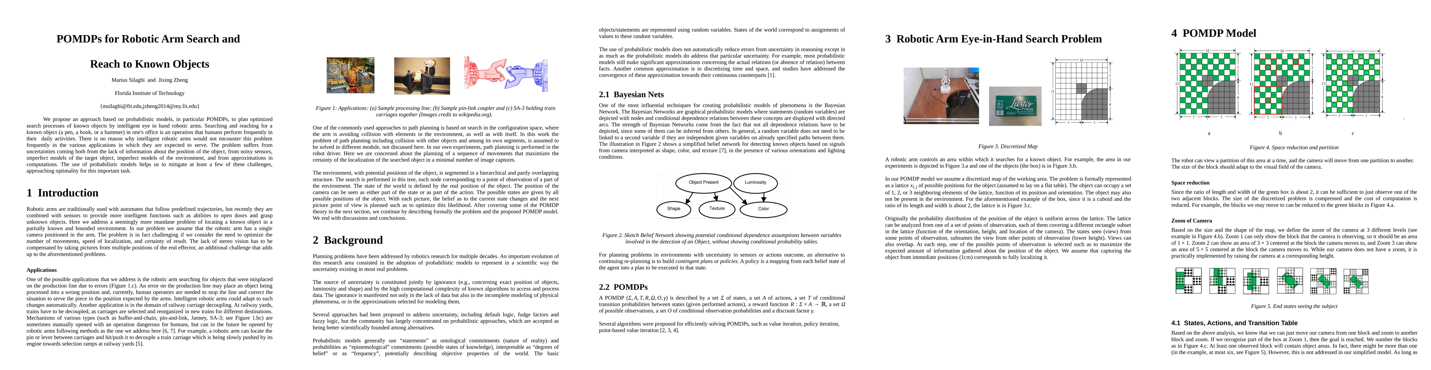 We propose an approach based on probabilistic models, in particular POMDPs, to plan optimized search processes of known objects by intelligent eye in hand robotic arms. Searching and reaching for a known object (a pen, a book, or a hammer) in one's office is an operation that humans perform frequently in their daily activities. There is no reason why intelligent robotic arms would not encounter this problem frequently in the various applications in which they are expected to serve. The problem suffers from uncertainties coming both from the lack of information about the position of the object, from noisy sensors, imperfect models of the target object, of imperfect models of the environment, and from approximations in computations. The use of probabilistic models helps us to mitigate at least a few of these challenges, approaching optimality for this important task.