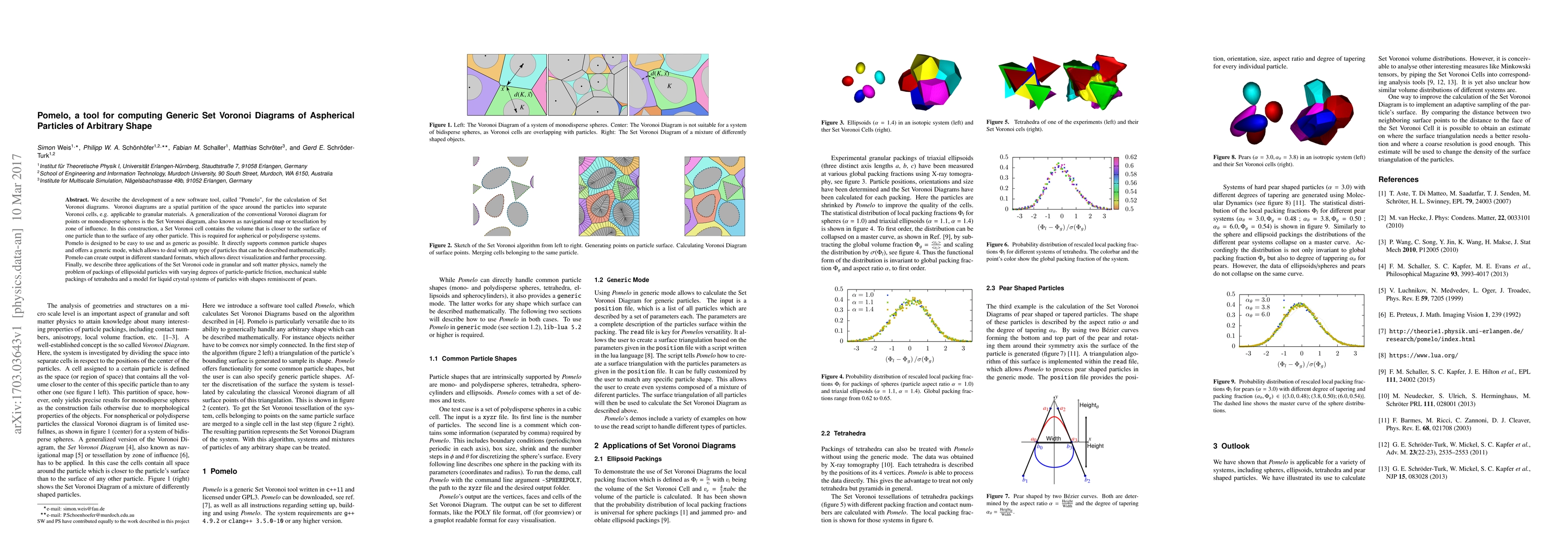 We describe the development of a new software tool, called "Pomelo", for the calculation of Set Voronoi diagrams. Voronoi diagrams are a spatial partition of the space around the particles into separate Voronoi cells, e.g. applicable to granular materials. A generalization of the conventional Voronoi diagram for points or monodisperse spheres is the Set Voronoi diagram, also known as navigational map or tessellation by zone of influence. In this construction, a Set Voronoi cell contains the volume that is closer to the surface of one particle than to the surface of any other particle. This is required for aspherical or polydisperse systems. Pomelo is designed to be easy to use and as generic as possible. It directly supports common particle shapes and offers a generic mode, which allows to deal with any type of particles that can be described mathematically. Pomelo can create output in different standard formats, which allows direct visualization and further processing. Finally, we describe three applications of the Set Voronoi code in granular and soft matter physics, namely the problem of packings of ellipsoidal particles with varying degrees of particle-particle friction, mechanical stable packings of tetrahedra and a model for liquid crystal systems of particles with shapes reminiscent of pears