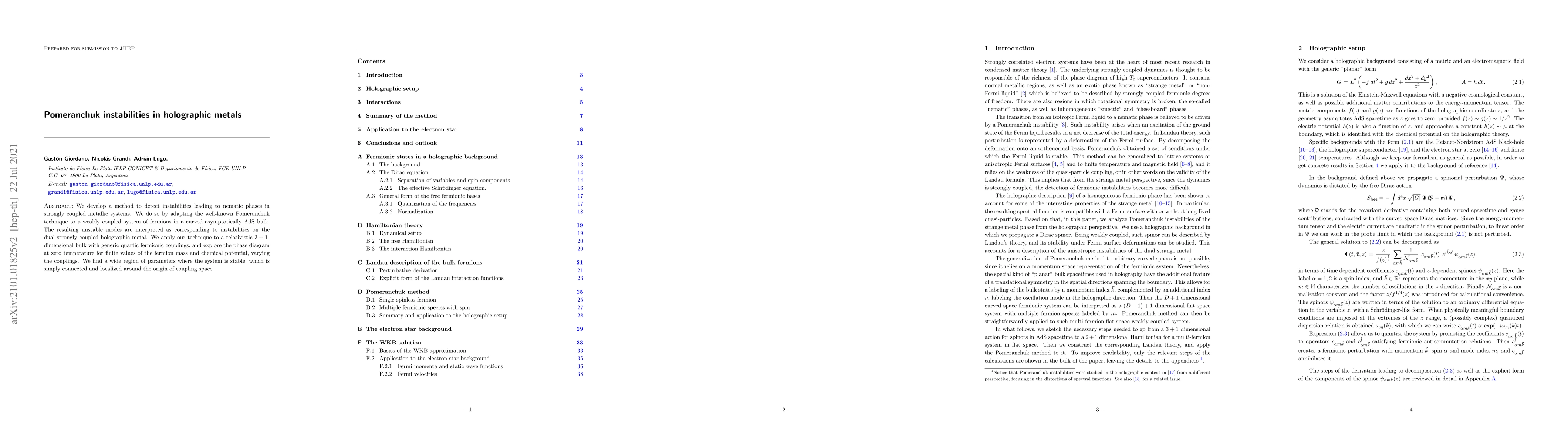 We develop a method to detect instabilities leading to nematic phases in strongly coupled metallic systems. We do so by adapting the well-known Pomeranchuk technique to a weakly coupled system of fermions in a curved asymptotically AdS bulk. The resulting unstable modes are interpreted as corresponding to instabilities on the dual strongly coupled holographic metal. We apply our technique to a relativistic $3+1$-dimensional bulk with generic quartic fermionic couplings, and explore the phase diagram at zero temperature for finite values of the fermion mass and chemical potential, varying the couplings. We find a wide region of parameters where the system is stable, which is simply connected and localized around the origin of coupling space.