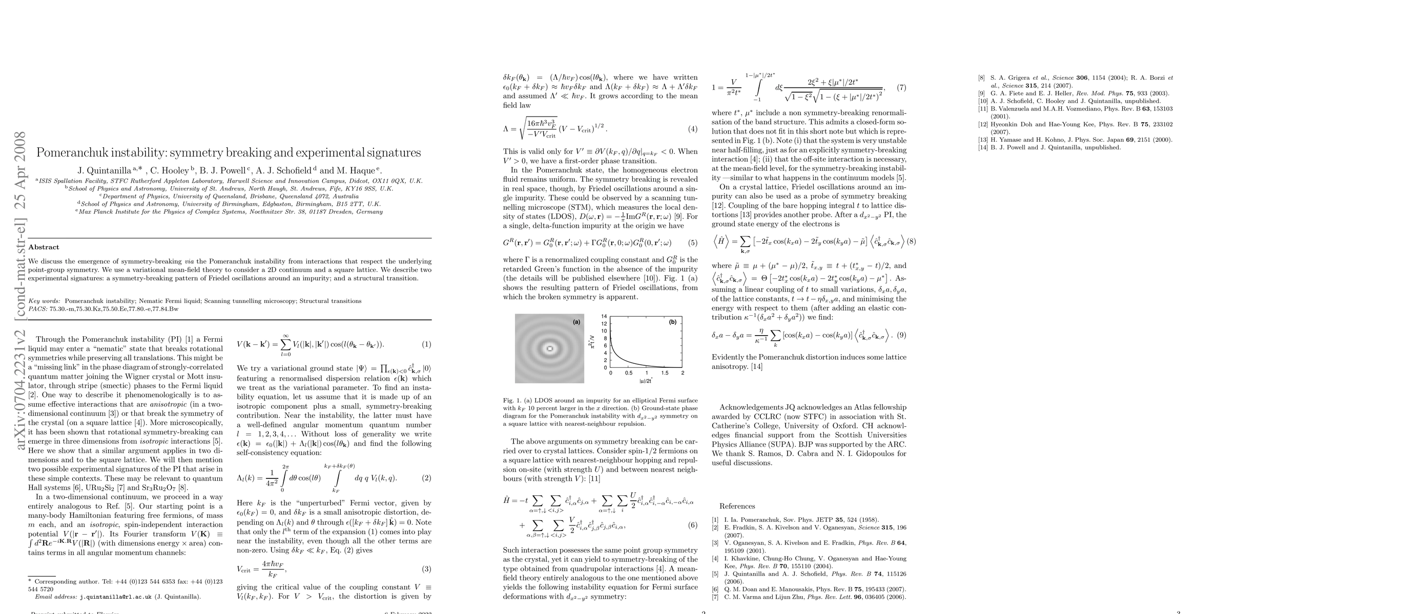 This research explores the Pomeranchuk instability causing symmetry-breaking through point-group symmetric interactions in 2D continua and square lattices. It identifies two experimental signatures: distinct Friedel oscillation patterns around impurities and structural transitions.