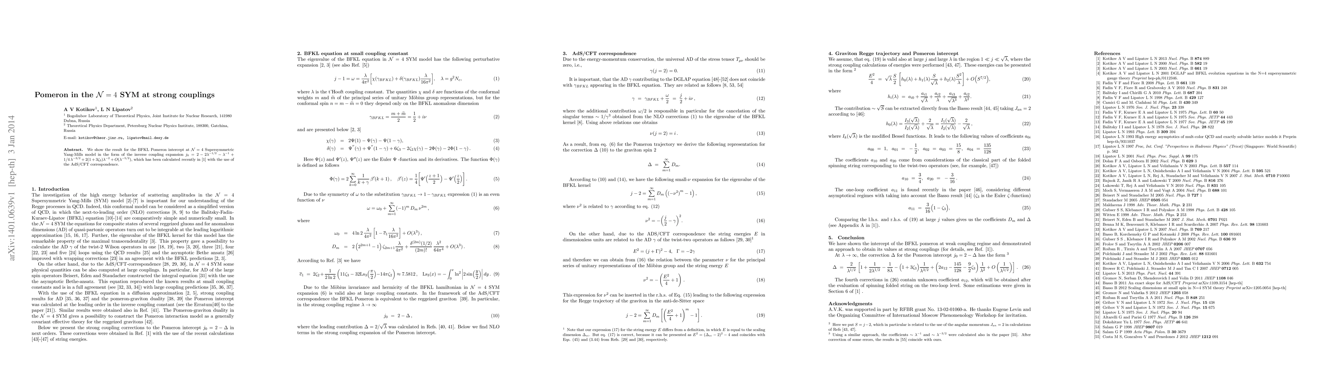 We show the result for the BFKL Pomeron intercept at N=4 Supersymmetric Yang-Mills model in the form of the inverse coupling expansion j0=2-2 lambda**(-1/2)- lambda**(-1) + 1/4 lambda**(-3/2) + 2(1+3zeta3) lambda**(-2) + O(lambda**(-5/2)), which has been calculated recently in [1] with the use of the AdS/CFT correspondence.