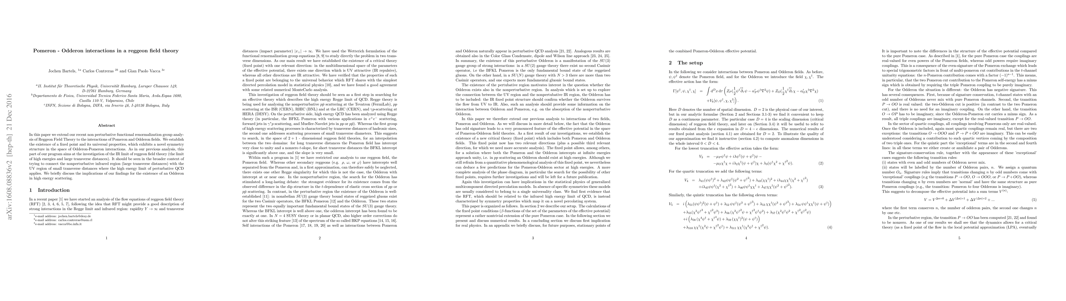 In this paper we extend our recent non perturbative functional renormalization group analysis of Reggeon Field Theory to the interactions of Pomeron and Odderon fields. We establish the existence of a fixed point and its universal properties, which exhibits a novel symmetry structure in the space of Odderon-Pomeron interactions. As in our previous analysis, this part of our program aims at the investigation of the IR limit of reggeon field theory (the limit of high energies and large transverse distances). It should be seen in the broader context of trying to connect the nonperturbative infrared region (large transverse distances) with the UV region of small transverse distances where the high energy limit of perturbative QCD applies.
