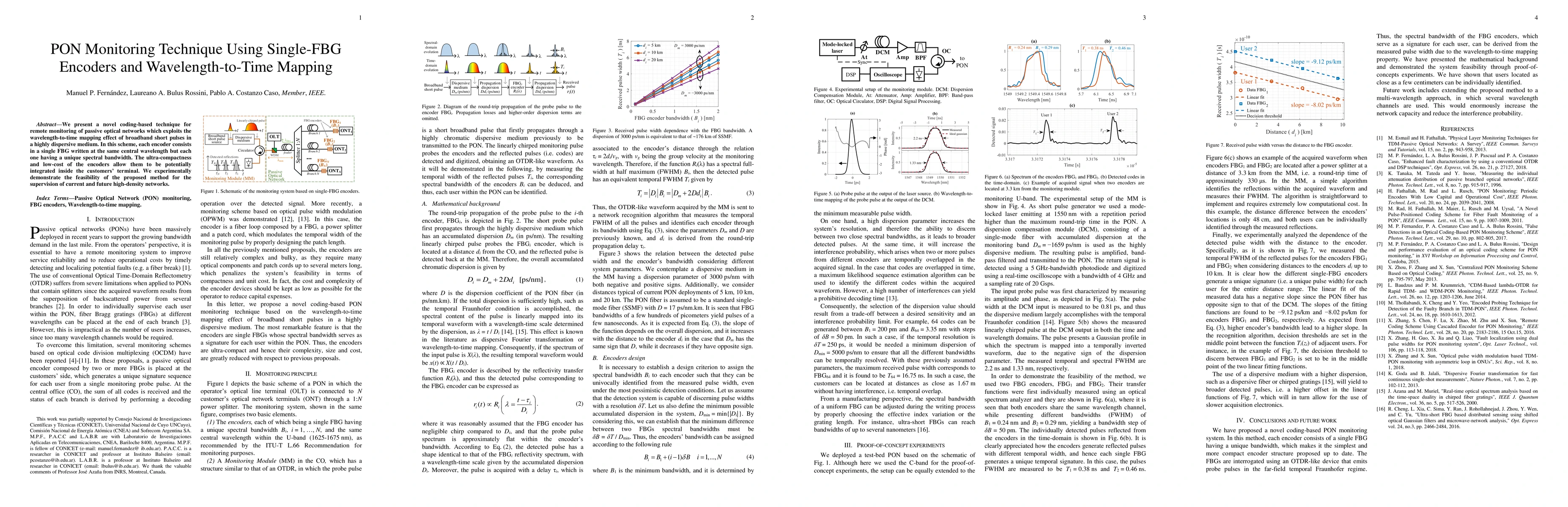 This paper introduces a novel technique for monitoring passive optical networks using single-FBG encoders and wavelength-to-time mapping, demonstrating its feasibility for high-density network supervision with compact, low-cost encoders. The method leverages the dispersion effect of broadband pulses to achieve remote monitoring.