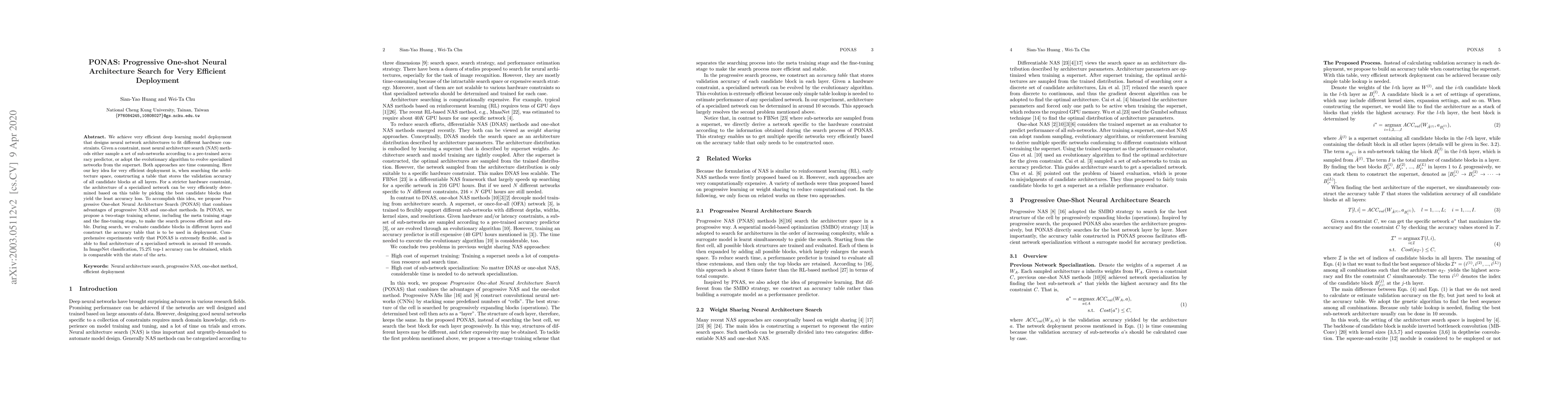 PONAS proposes a method for efficient neural architecture search that constructs an accuracy table during training to quickly determine optimal network architectures for specific hardware constraints. This two-stage training approach enables rapid deployment with high accuracy, achieving 75.2% top-1 accuracy on ImageNet.