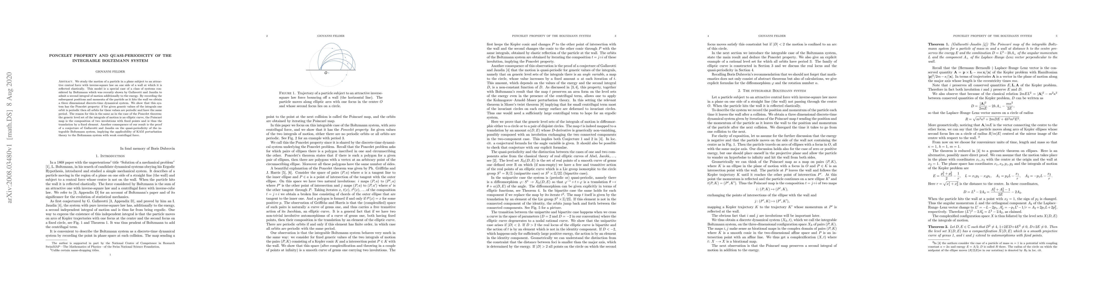 We study the motion of a particle in a plane subject to an attractive central force with inverse-square law on one side of a wall at which it is reflected elastically. This model is a special case of a class of systems considered by Boltzmann which was recently shown by Gallavotti and Jauslin to admit a second integral of motion additionally to the energy. By recording the subsequent positions and momenta of the particle as it hits the wall we obtain a three dimensional discrete-time dynamical system. We show that this system has the Poncelet property: if for given generic values of the integrals one orbit is periodic then all orbits for these values are periodic and have the same period. The reason for this is the same as in the case of the Poncelet theorem: the generic level set of the integrals of motion is an elliptic curve, the Poincar\'e map is the composition of two involutions with fixed points and is thus the translation by a fixed element. Another consequence of our result is the proof of a conjecture of Gallavotti and Jauslin on the quasi-periodicity of the integrable Boltzmann system, implying the applicability of KAM perturbation theory to the Boltzmann system with weak centrifugal force.