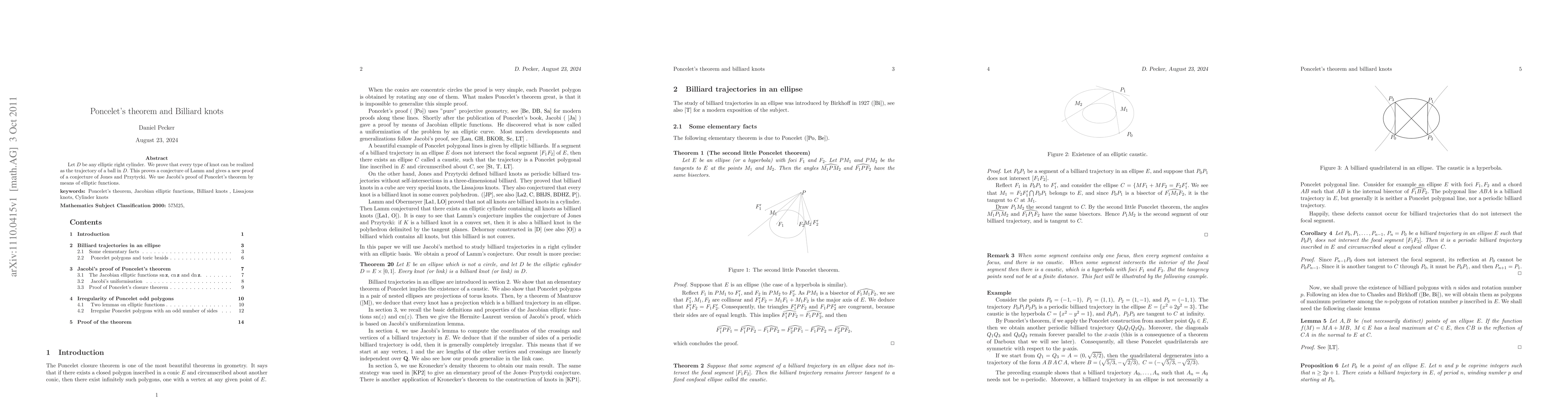 Summary: This paper proves that any knot type can be realized as the trajectory of a ball in a specific elliptic right cylinder, providing a new proof using Jacobi's elliptic functions and validating conjectures of Lamm, Jones, and Przytycki. The result leverages Poncelet's theorem.