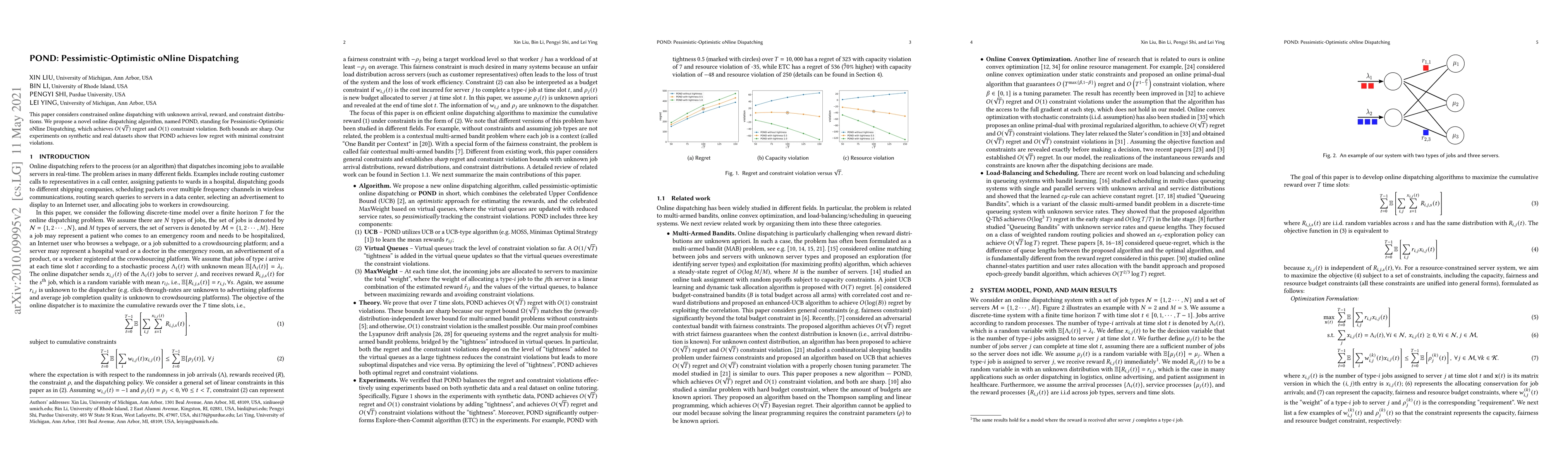 Researchers developed POND, an online dispatching algorithm that balances regret and constraint violations in constrained environments, achieving $O( extsuperscript{ extperp} T)$ regret with $O(1)$ constraint violation bounds.