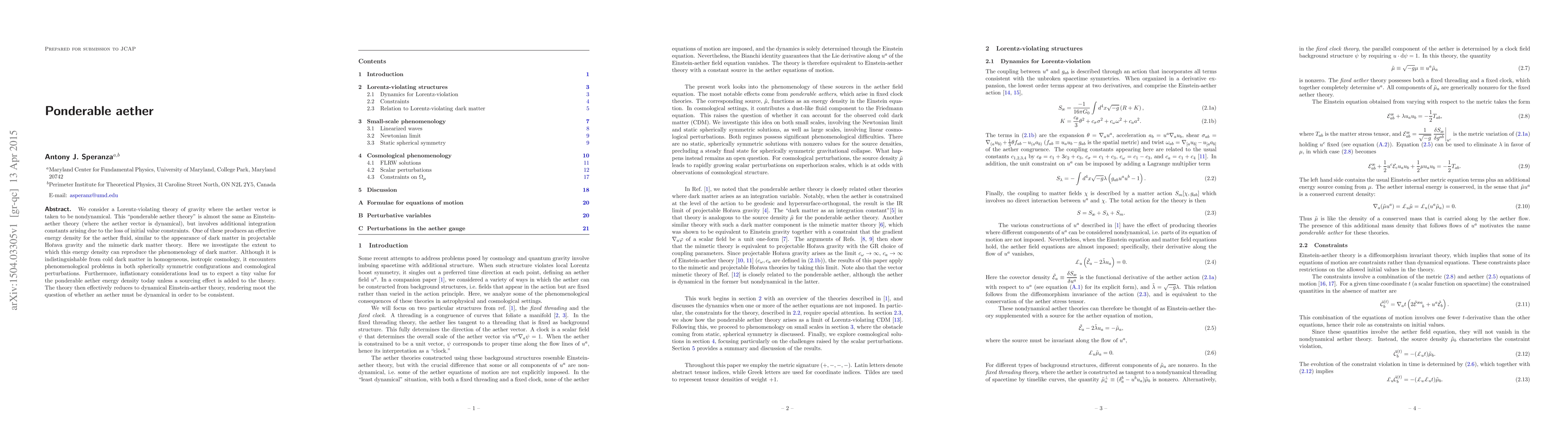 This paper explores a nondynamical Lorentz-violating gravity theory featuring a ponderable aether, which can mimic dark matter in certain cosmological contexts but faces challenges in spherical symmetry and perturbations, suggesting that its energy density is minimal unless supplemented with additional sourcing effects.