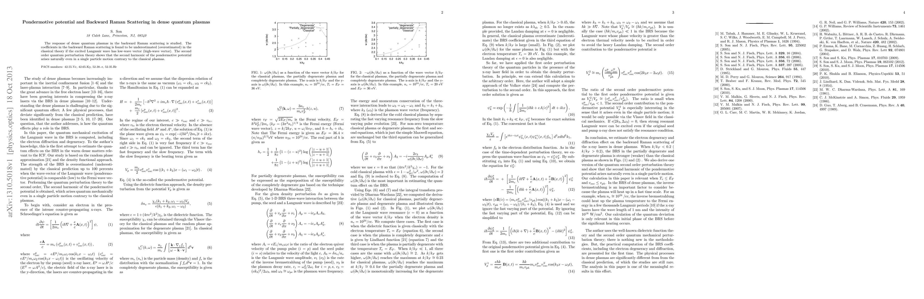 Summary: This study reveals discrepancies in classical theory for backward Raman scattering in dense quantum plasmas, showing that coefficients are underestimated (overestimated) for low (high) wave vector excited Langmuir waves. Quantum perturbation theory indicates the natural emergence of second harmonic in the pondermotive potential in single particle motion.