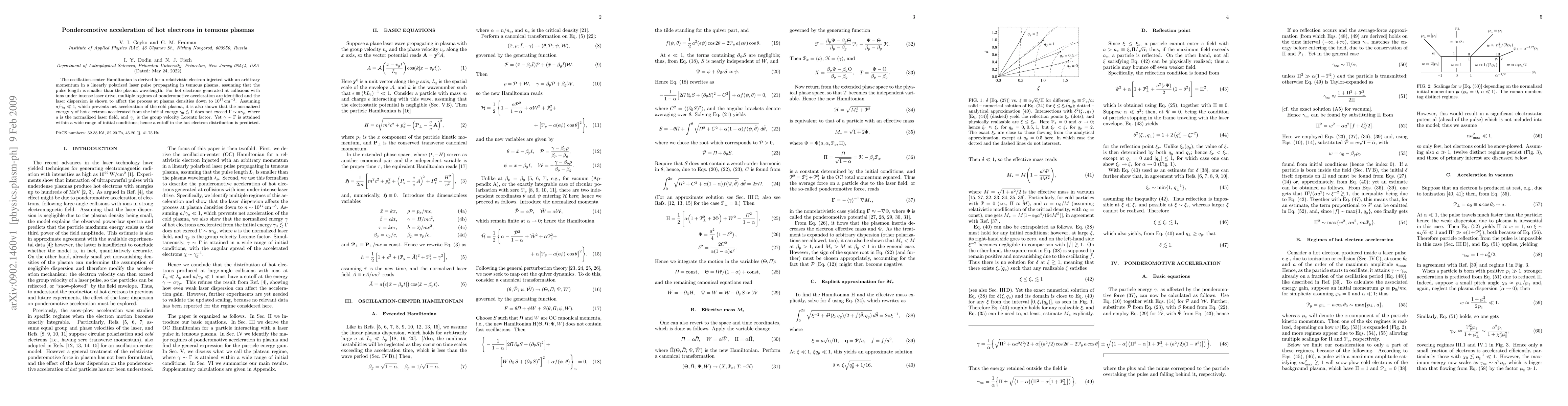 The oscillation-center Hamiltonian is derived for a relativistic electron injected with an arbitrary momentum in a linearly polarized laser pulse propagating in tenuous plasma, assuming that the pulse length is smaller than the plasma wavelength. For hot electrons generated at collisions with ions under intense laser drive, multiple regimes of ponderomotive acceleration are identified and the laser dispersion is shown to affect the process at plasma densities down to 10^17 cm-3. Assuming a/gamma_g << 1, which prevents net acceleration of the cold plasma, it is also shown that the normalized energy gamma of hot electrons accelerated from the initial energy gamma_0 <~ Gamma does not exceed Gamma ~ a gamma_g, where a is the normalized laser field, and gamma_g is the group velocity Lorentz factor. Yet gamma ~ Gamma is attained within a wide range of initial conditions; hence a cutoff in the hot electron distribution is predicted.
