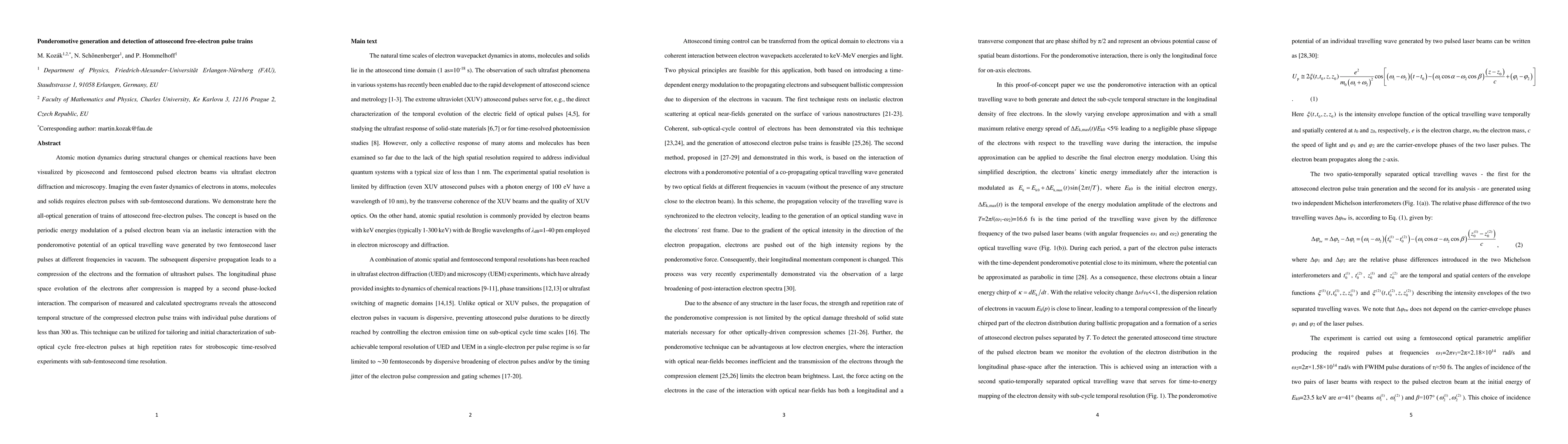 This paper demonstrates the all-optical generation of trains of attosecond free-electron pulses via ponderomotive modulation and dispersive propagation, enabling sub-femtosecond time resolution imaging of atomic dynamics. The technique uses a combination of femtosecond laser pulses and electron beam interactions to achieve electron pulse trains with durations below 300 attoseconds.