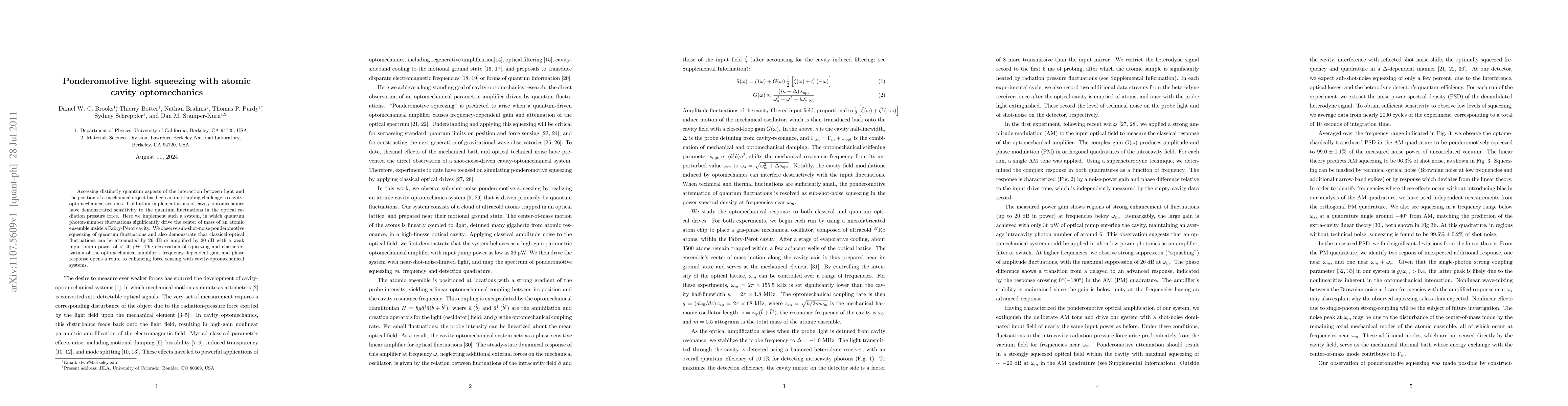 Accessing distinctly quantum aspects of the interaction between light and the position of a mechanical object has been an outstanding challenge to cavity-optomechanical systems. Only cold-atom implementations of cavity optomechanics have indicated effects of the quantum fluctuations in the optical radiation pressure force. Here we use such a system, in which quantum photon-number fluctuations significantly drive the center of mass of an atomic ensemble inside a Fabry-Perot cavity. We show that the optomechanical response both amplifies and ponderomotively squeezes the quantum light field. We also demonstrate that classical optical fluctuations can be attenuated by 26 dB or amplified by 20 dB with a weak input pump power of < 40 pW, and characterize the optomechanical amplifier's frequency-dependent gain and phase response in both the amplitude and phase-modulation quadratures.
