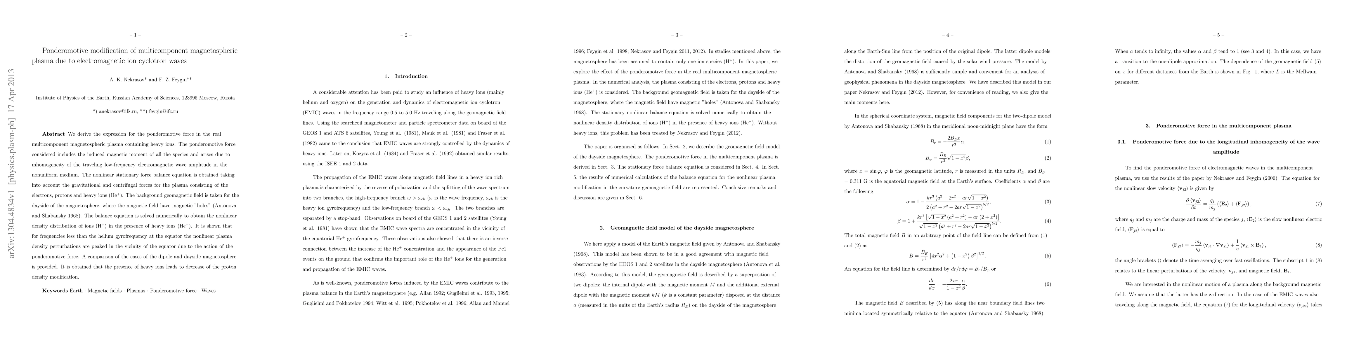 This paper derives the ponderomotive force expression in multicomponent magnetospheric plasma, considering heavy ions and electromagnetic ion cyclotron waves. It shows that ponderomotive force induces nonlinear density perturbations in plasma, particularly affecting proton density in the presence of heavy ions, with implications for the dayside magnetosphere.