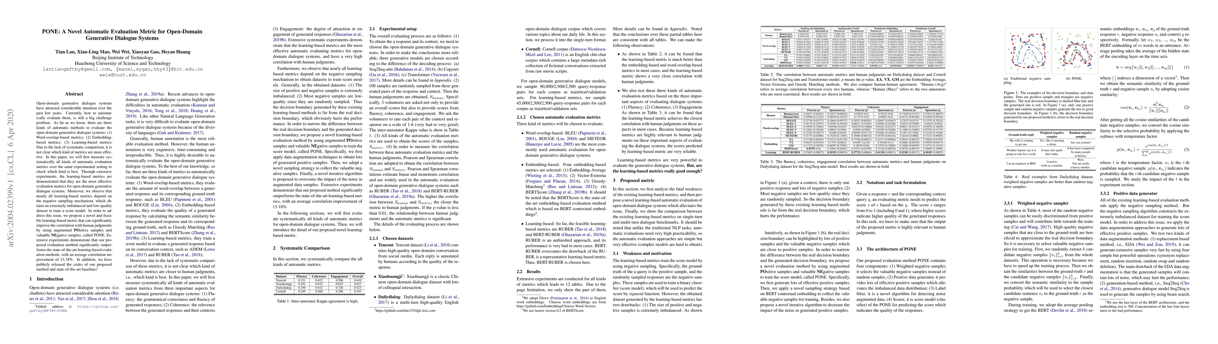 This paper proposes PONE, a novel automatic evaluation metric for open-domain generative dialogue systems, demonstrating that learning-based metrics are most effective. The authors introduce PONE to improve the correlation with human judgments by using augmented positive and negative samples, achieving a 13.18% improvement over existing methods.