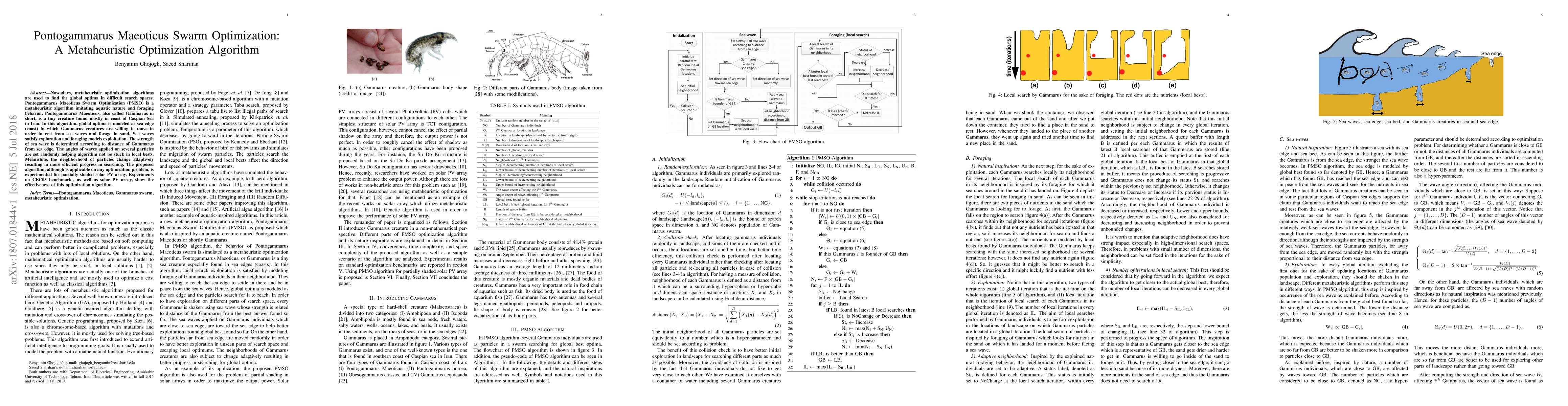 The Pontogammarus Maeoticus Swarm Optimization (PMSO) algorithm mimics the foraging behavior of Gammarus creatures to find global optima in complex search spaces, modeled as the sea edge. It effectively avoids local optima and adapts neighborhood changes for efficient optimization, demonstrated through experiments on solar PV array optimization.