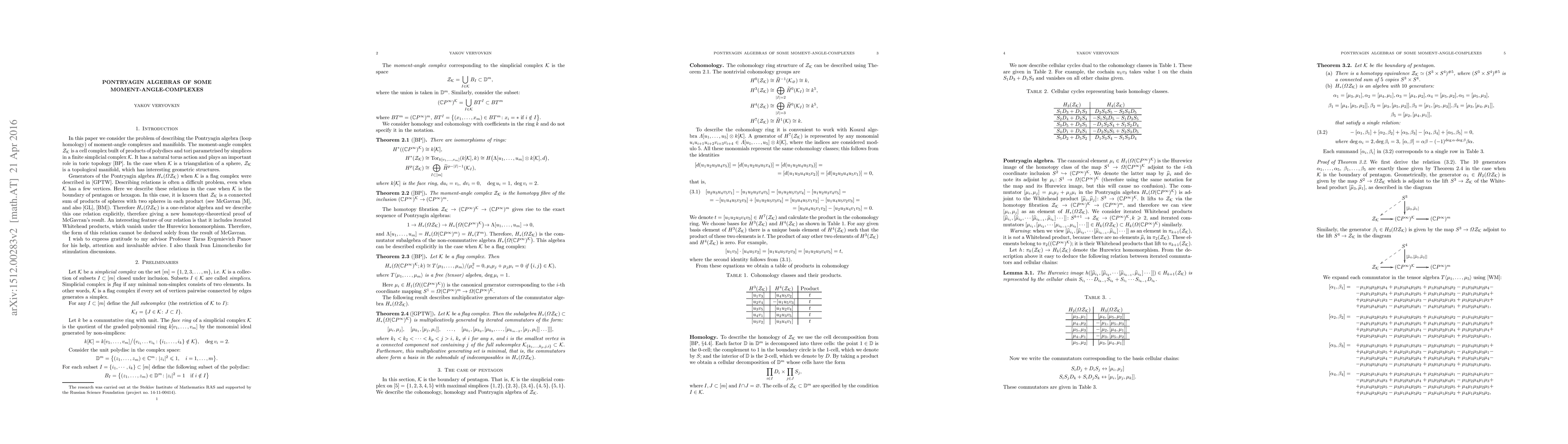 We consider the problem of describing the Pontryagin algebra (loop homology) of moment-angle complexes and manifolds. The moment-angle complex Z_K is a cell complex built of products of polydiscs and tori parametrised by simplices in a finite simplicial complex K. It has a natural torus action and plays an important role in toric topology. In the case when K is a triangulation of a sphere, Z_K is a topological manifold, which has interesting geometric structures. Generators of the Pontryagin algebra H_*(\Omega Z_K) when K is a flag complex have been described in the work of Grbic, Panov, Theriault and Wu. Describing relations is often a difficult problem, even when K has a few vertices. Here we describe these relations in the case when K is the boundary of a pentagon or a hexagon. In this case, it is known that Z_K is a connected sum of products of spheres with two spheres in each product. Therefore H_*(\Omega Z_K) is a one-relator algebra and we describe this one relation explicitly, therefore giving a new homotopy-theoretical proof of McGavran's result. An interesting feature of our relation is that it includes iterated Whitehead products which vanish under the Hurewicz homomorphism. Therefore, the form of this relation cannot be deduced solely from the result of McGavran.